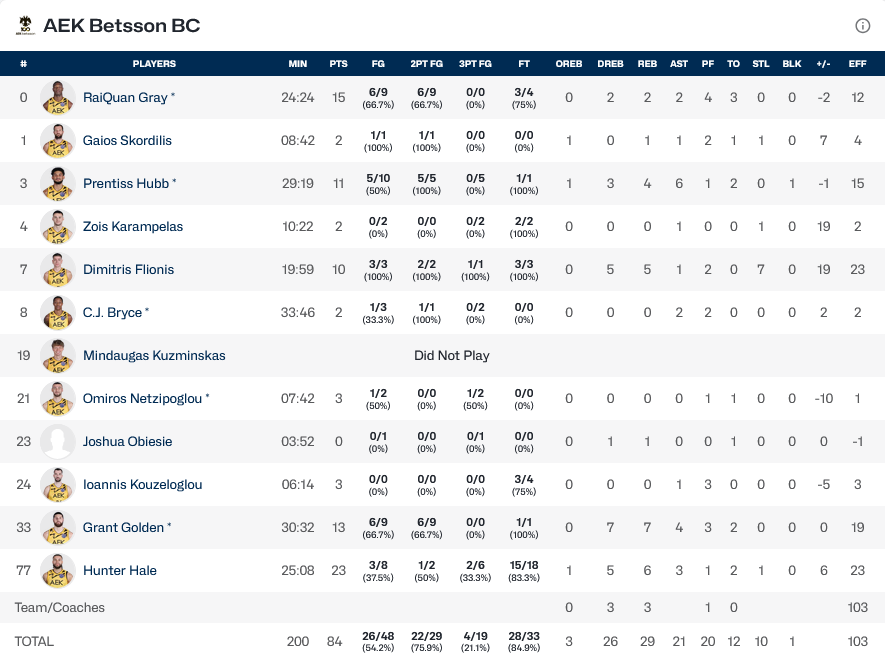 Ξεχώρισαν: Από την ΑΕΚ διακρίθηκαν οι Γκρέι (15 πόντοι), Γκόλντεν (13 πόντοι), Χαμπ (11 πόντοι) και Φλιώνης (10 πόντοι) αντίστοιχα. Από την Βίρτσμπουργκ σκόραρε ο Σέλιας με 19 πόντους, με τους Κλάασεν και Μίντζ να βάζουν από εννέα πόντους έκαστος.