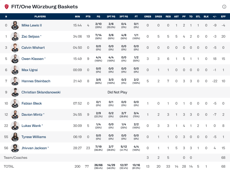 Η μεγαλύτερη διαφορά: Οι 17 πόντοι για την Βίρτσμπουργκ (13-30) στο 8' λεπτό
