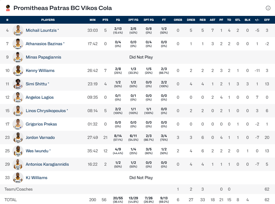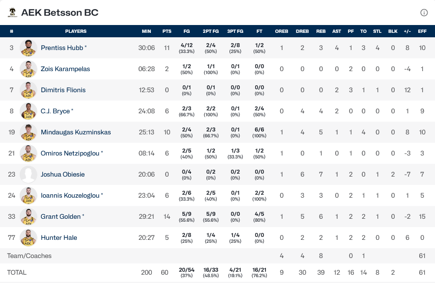 Ξεχώρισαν: Γκόλντεν με 14 πόντους, Χαμπ με 11 και Κουζμίνσκας με 10, ήταν οι κορυφαίοι της ΑΕΚ. Για τον Προμηθέα, εκτός του Βαρνάντο, ο Ιβούντου είχε 12 πόντους.