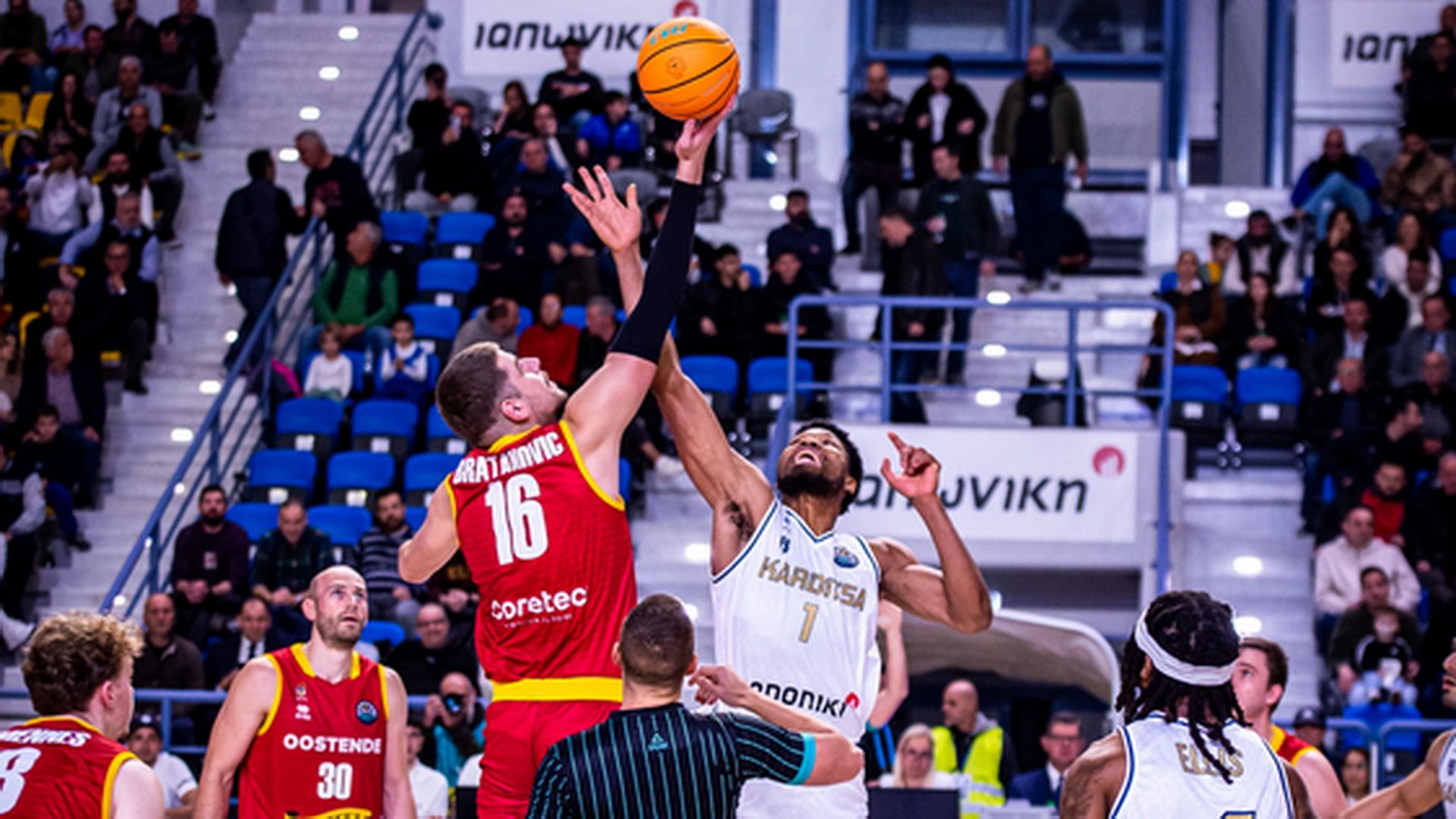 Ο παίκτης των Θεσσαλών έπεσε στο παρκέ, πιάνοντας το δεξί του γόνατο, μετά από σύγκρουση που είχε με παίκτη της Οστάνδης, 3’ πριν το φινάλε του ημιχρόνου.