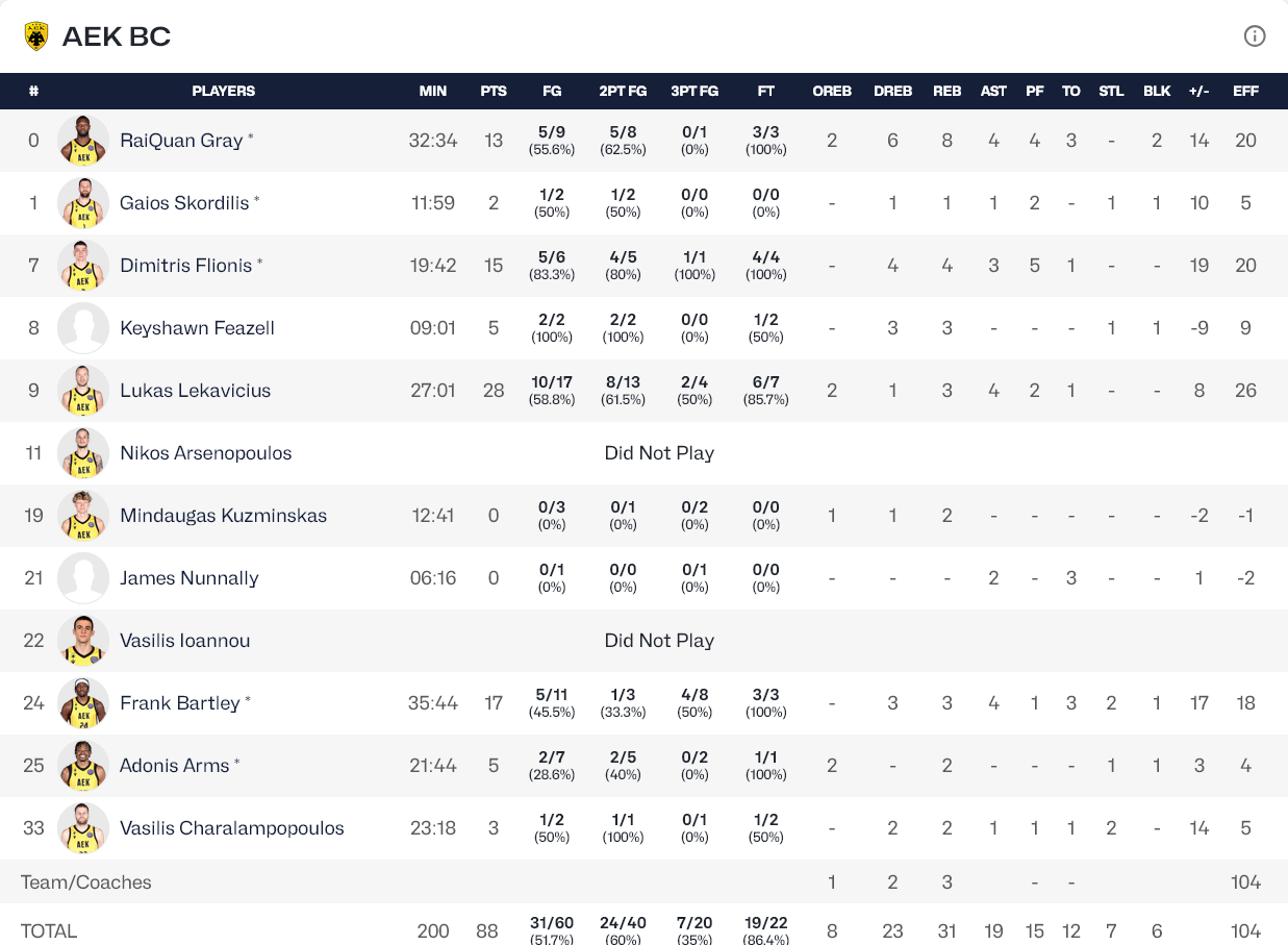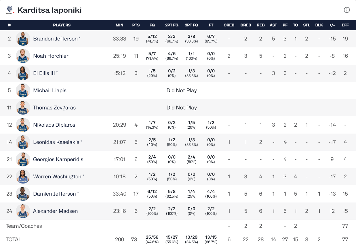 Ξεχώρισαν: Από την ΑΕΚ έβαλε ο Μπάρτλει 17 πόντους . Από την Καρδίτσα σκόραραν οι Μπ. Τζέφερσον και Ντ. Τζέφερσον με 19 και 17 πόντους.