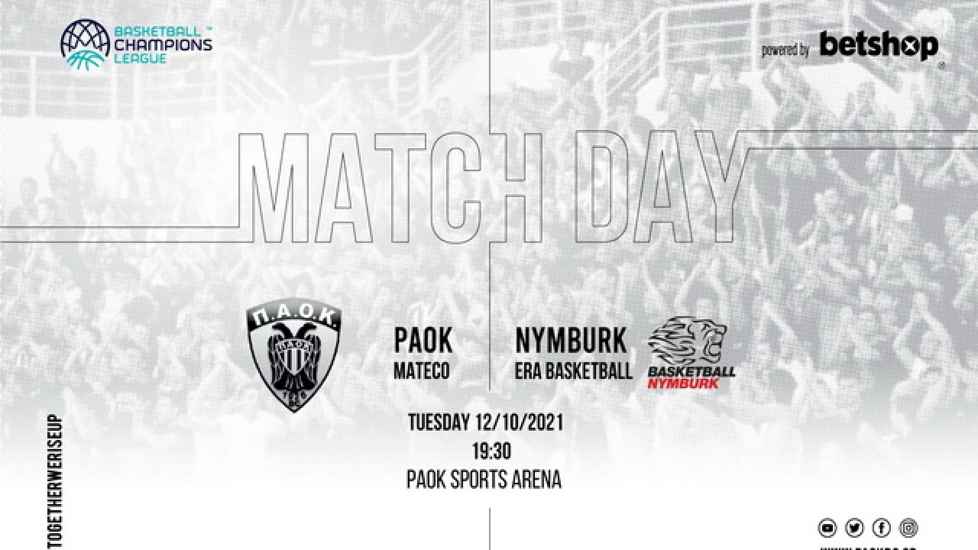 Η ΚΑΕ ΠΑΟΚ mateco ανακοινώνει ότι ξεκίνησε η OnLine διάθεση των εισιτηρίων για τον πρώτο εντός έδρας αγώνα του Basketball Champions League, με αντίπαλο την ERA Nymburk, που θα διεξαχθεί στο PAOK Sports Arena, την Τρίτη 12 Οκτωβρίου 2021 στις 19:30.