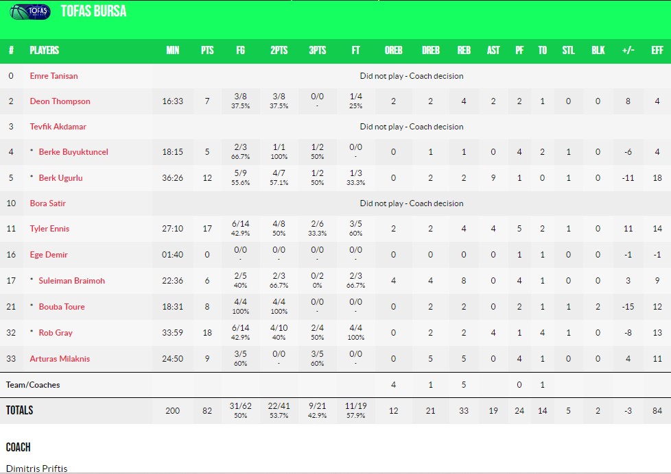 Ο Αμερικανός έκανε εμφατικό νταμπλ νταμπλ με 21 πόντους και 14 ριμπάουντ και οδήγησε τους κιτρινόμαυρους στο δρόμο των επιτυχιών. Από την άλλη για την τουρκική ομάδα πρώτος σκόρερ ήταν ο Γκρέι με 18 πόντους.