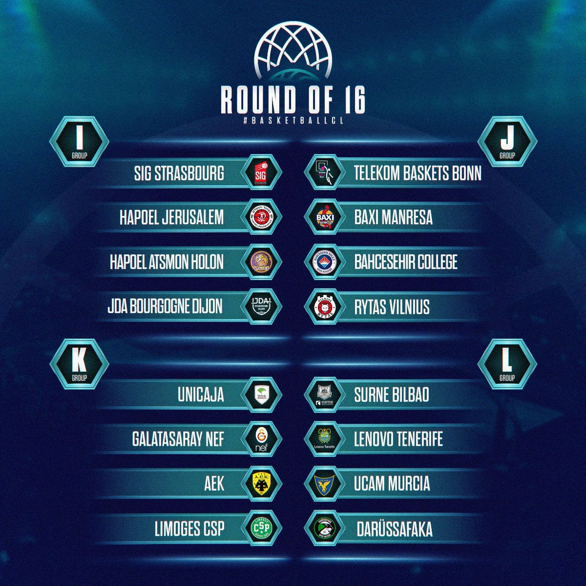 GROUP L: Surne Bilbao (ESP); Lenovo Tenerife (ESP); Darussafaka (TUR); UCAM Murcia (ESP)