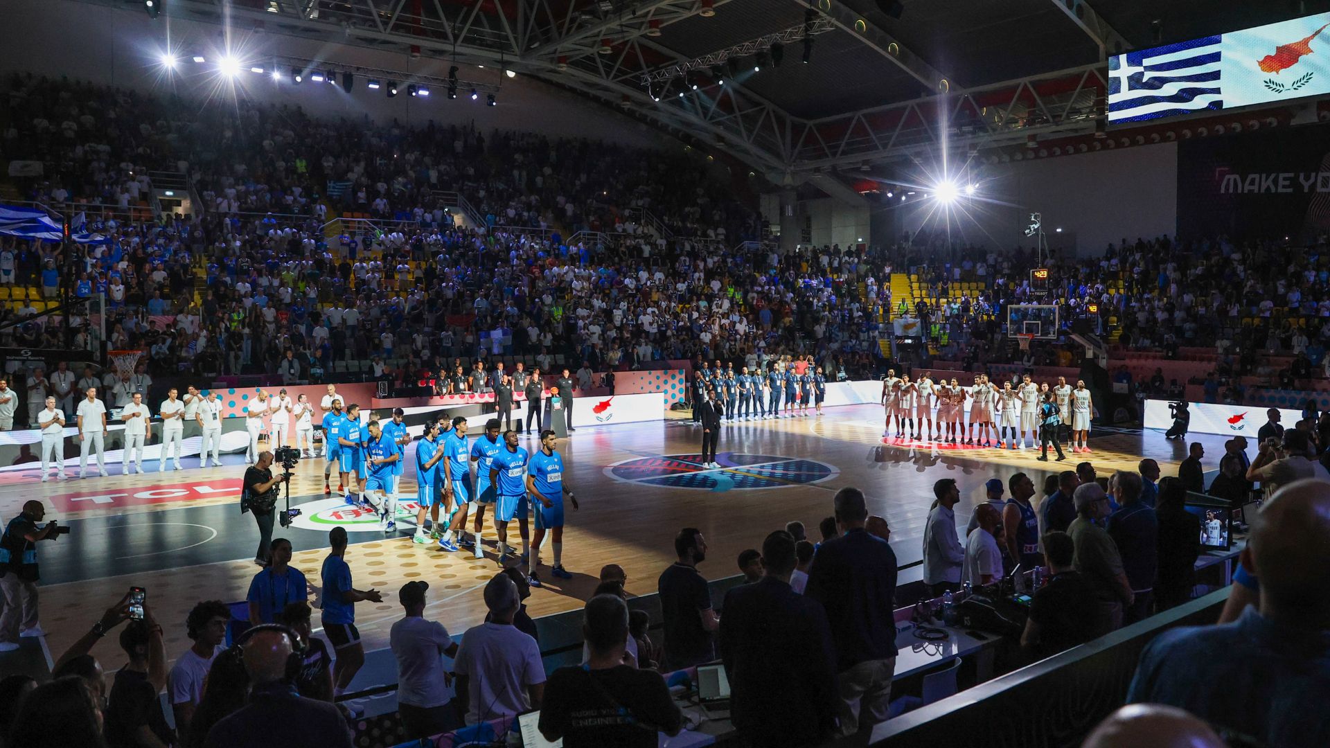 Η Εθνική Ανδρών αντιμετωπίζει αυτή την ώρα την Κύπρο στο πλαίσιο της 2ης αγωνιστικής της φάσης των ομίλων του Eurobasket, όμως πριν την έναρξη της αναμέτρησης η ζωντανή εκτέλεση του κοινού Εθνικού ύμνου στο κατάμεστο “Σπύρος Κυπριανού” είχε ιστορική σημασία για τις δύο ομάδες.