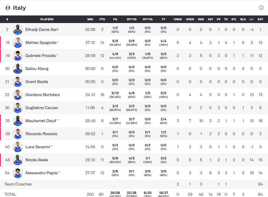 Οι Ιταλοί ευτύχησαν να έχουν πέντε παίκτες τους σε διψήφιο αριθμό πόντων, με τον Μπορτολάνι να έχει 16, τον Σπανιόλο 14, ενώ οι Παγιόλα και Προσίντα είχαν από 12 έκαστος και ο Ακέλε 11.