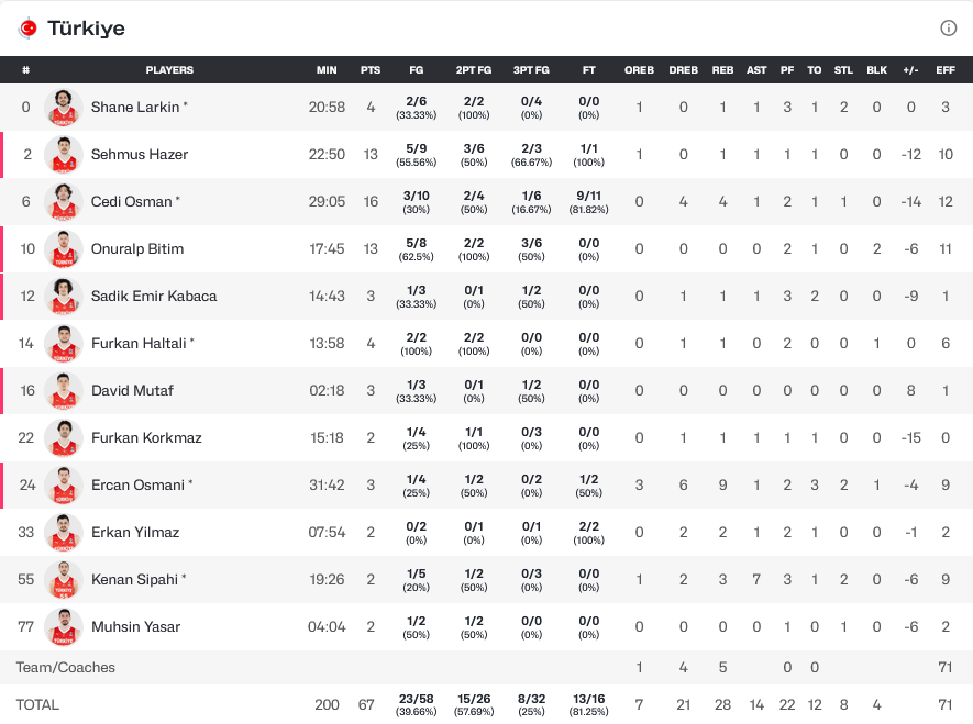 Για την Τουρκία, ο Τσέντι Οσμάν ήταν ο κορυφαίος με 16 πόντους, με τους Χαζέρ και Μπιτίμ να προσθέτουν από 13 έκαστος.