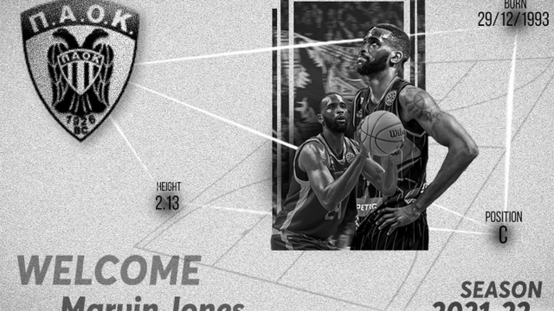 Η ΚΑΕ ΠΑΟΚ ανακοινώνει τη συμφωνία με τον Αμερικανό καλαθοσφαιριστή Marvin Jones, ο οποίος θα υπογράψει συμβόλαιο μονοετούς διάρκειας με την ομάδα μας. Καλωσορίζουμε τον Marvin Jones στη μεγάλη οικογένεια του ΠΑΟΚ.