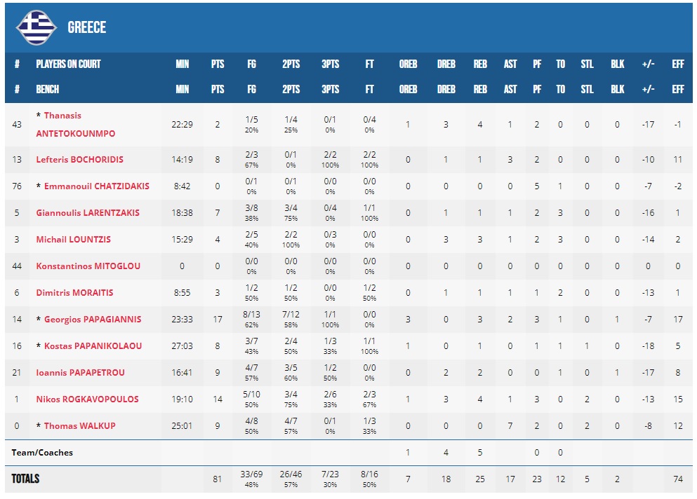 Από τις ΗΠΑ διακρίθηκε ο Ριβς με 15 πόντους, 5 ριμπάουντ και 6 ασίστ, ενώ οι Μπράνσον (3 ριμπάουντ και 2 ασίστ) και Έντουαρντς (2 ριμπάουντ και 3 ασίστ) σκόραραν από 13 πόντους έκαστος. Από την Ελλάδα ξεχώρισαν οι Παπαγιάννης (3 ριμπάουντ και 2 ασίστ) και Ρογκαβόπουλος (4 ριμπάουντ και 1 ασίστ) με 17 και 14 πόντους αντίστοιχα.