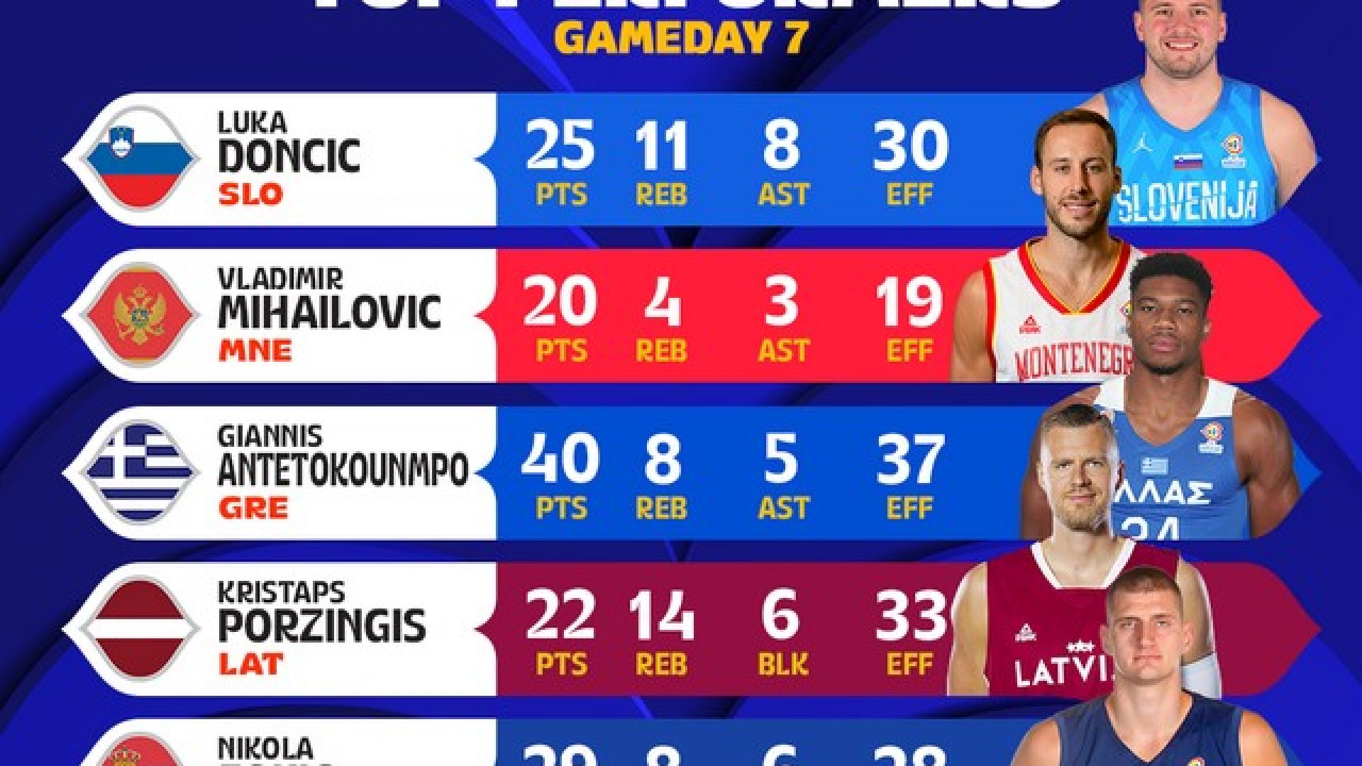 Αμέσως μετά βείσκεται ο Πορζίνγκινς που με 22 πόντους και 14 ριμπάουντ μάζεψε 33 μονάδες, ενώ ακολουθούν οι Ντόνσιτς με 30 μονάδες, Γιόκιτς με 29 και Μιχαΐλοβιτς με 19.
