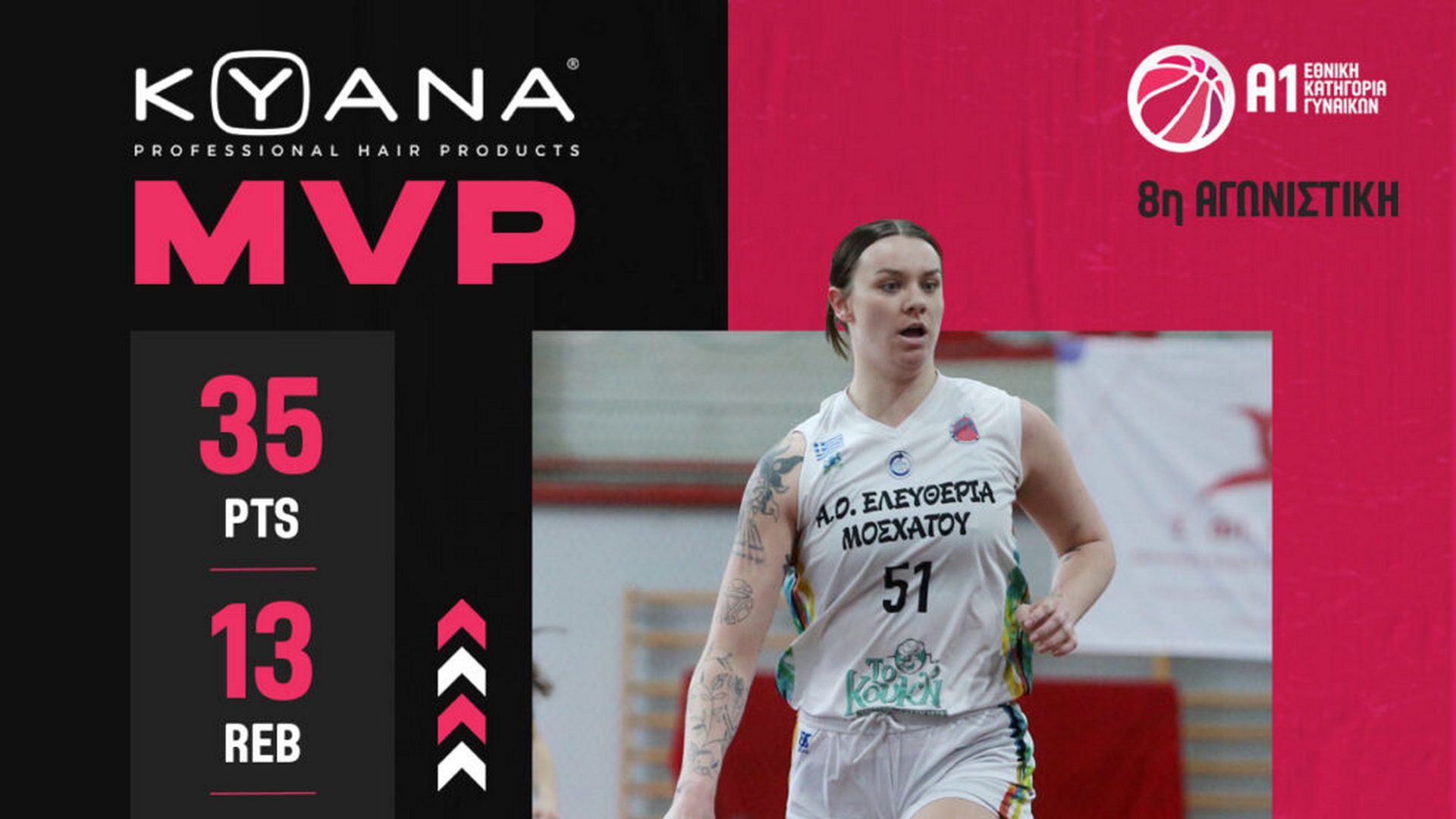 Από τη Ελευθερία Μοσχάτου έρχεται η KYANA MVP για την 8η Αγωνιστική της Α1 Γυναικών. Ο λόγος για την Κέιτλιν Αν Μπικλ, η οποία στην νίκη της ομάδας της με 78-72 επί του Αθηναϊκού τελείωσε την αναμέτρηση με 35 πόντους, 13 ριμπάουντ, 6 ασίστ, 3 τάπες και 45 στο σύστημα αξιολόγησης μετά από 31’42’’ λεπτά συμμετοχής.