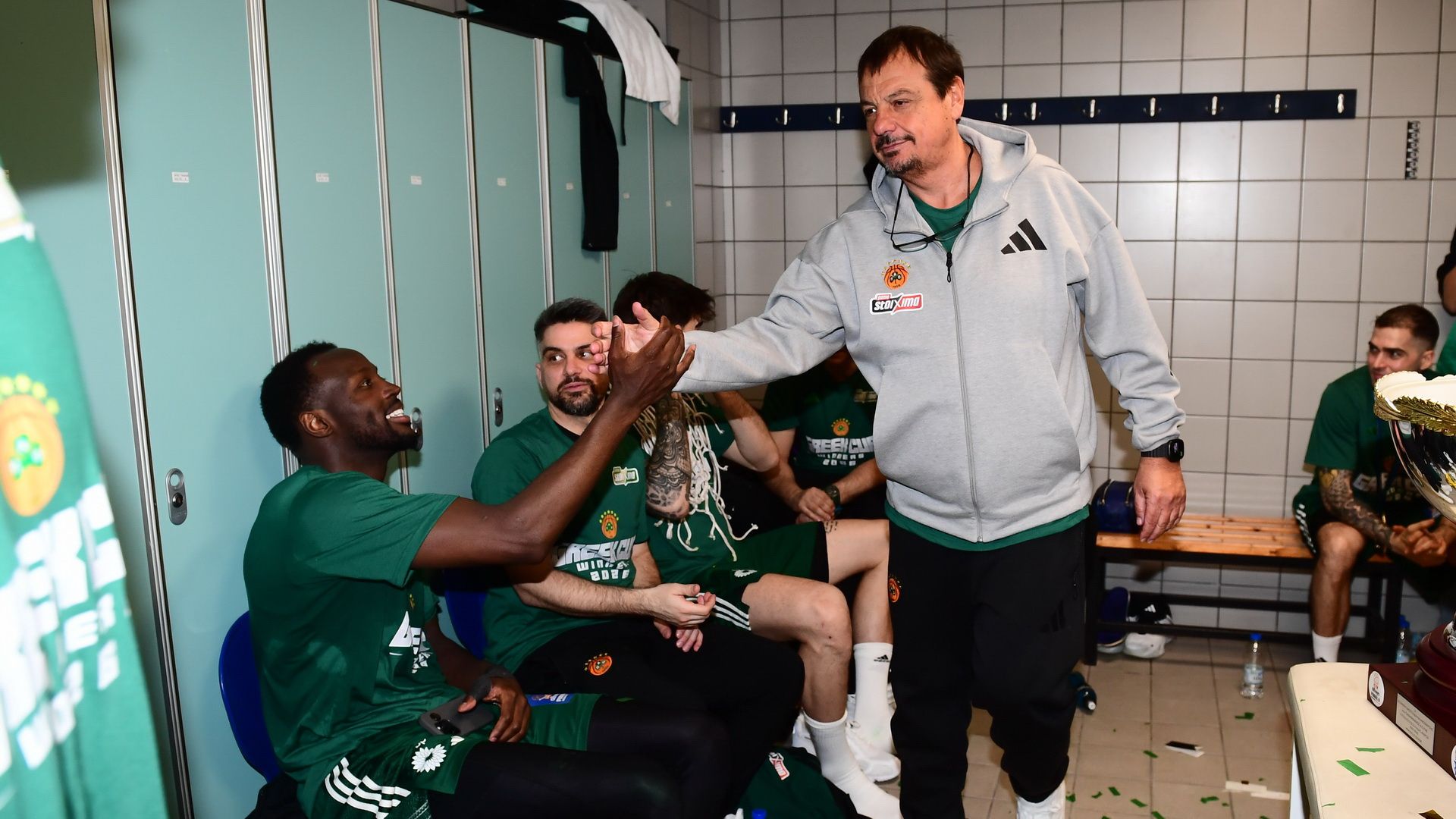 Ο Παναθηναϊκός στέφθηκε για δεύτερη σερί σεζόν κυπελλούχος Ελλάδας, με τον Εργκίν Αταμάν να μοιράζει συγχαρητήρια στους παίκτες του, στα αποδυτήρια του κλειστού της Νέας Αλικαρνασσού.