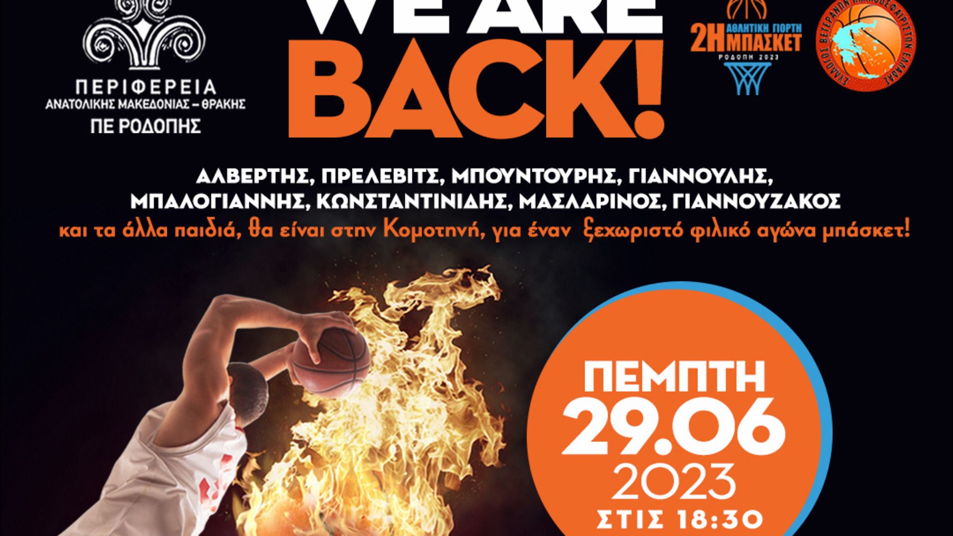 Η μεγάλη αθλητική γιορτή της Ροδόπης θα κορυφωθεί την Πέμπτη 29 Ιουνίου στις 18:00, με φιλική αναμέτρηση επίδειξης μεταξύ του Συλλόγου Βετεράνων Καλαθοσφαίρισης Ελλάδας και του Συνδέσμου Βετεράνων & Ερασιτεχνών Καλαθοσφαίρισης Κομοτηνής, στο Κλειστό Γυμναστήριο του 2ου Γενικού Λυκείου Κομοτηνής. Από την πλευρά των Βετεράνων Ελλάδας, θα αγωνιστούν οι, Φραγκίσκος Αλβέρτης, Γιώργος Μπαλογιάννης, Νίκος Μπουντούρης, Μπάνε Πρέλεβιτς, Γιάννης Γιαννούλης, Χρήστος Κωνσταντινίδης, Γιώργος Γιαννουζάκος και Δημήτρης Οικονομίδης, υπό τις κατευθύνσεις του Κυριάκου Ταξιλδάρη. Την ομάδα των τοπικών Βετεράνων συνθέτουν οι Νεοκλής Λεμονίδης, Χρήστος Νικάκης, Κωνσταντίνος Ντίνας, Βελή Χασάν, Νικόλαος Παπαδόπουλος, Ανέστης Σαββάκης, Στέλιος Σκοπιανός, Θεόδωρος Σταμπουλής, Γεώργιος Κουτσοβασίλης, Χαρίλαος Μπιμπισίδης, Κίμων Λεχούδης, Λεωνίδας Διαμαντίδης, οι οποίοι θα αγωνιστούν με τις κατευθύνσεις του προπονητή Γεώργιου Μαυρίδη.Ο Αντιπεριφερειάρχης ΠΕ Ροδόπης Νίκος Τσαλικίδης με αφορμή την έναρξη της 2ης Αθλητικής Γιορτής Μπάσκετ στη Ροδόπη, δήλωσε «Η τετραήμερη, φέτος, αθλητική γιορτή μπάσκετ στη Ροδόπη, αποδεικνύει τη βαρύτητα που αποδίδουμε ως Περιφερειακή Ενότητα σε παρεμβάσεις ανάπτυξης του ερασιτεχνικού αθλητισμού και της ποιότητας ζωής».