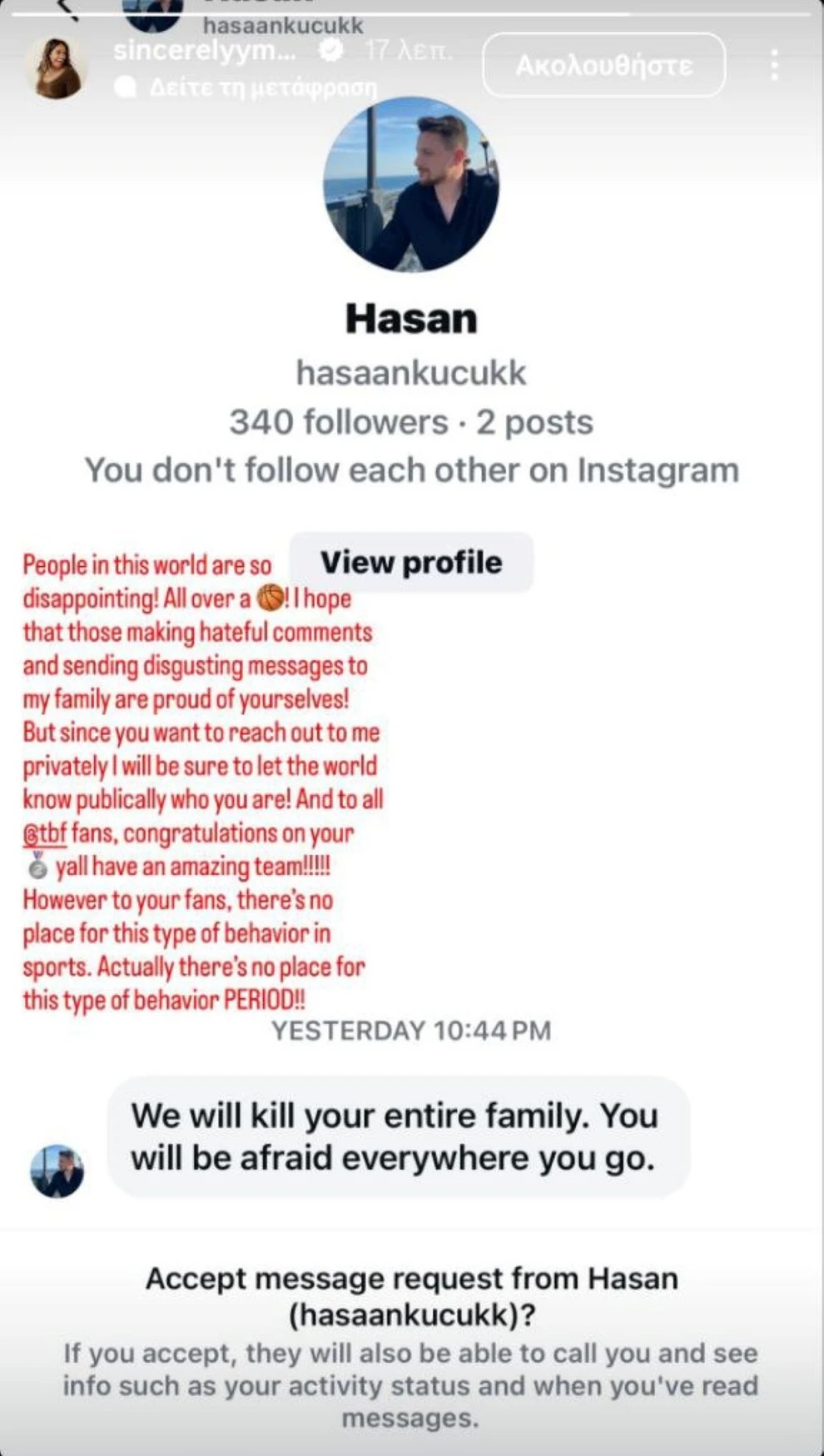 Η σύζυγος του Γιάννη Αντετοκούνμπο, Μαράια, δέχθηκε ένα απειλητικό μήνυμα από Τούρκο οπαδό, λέγοντάς της πως θα σκοτώσει όλη της την οικογένεια.