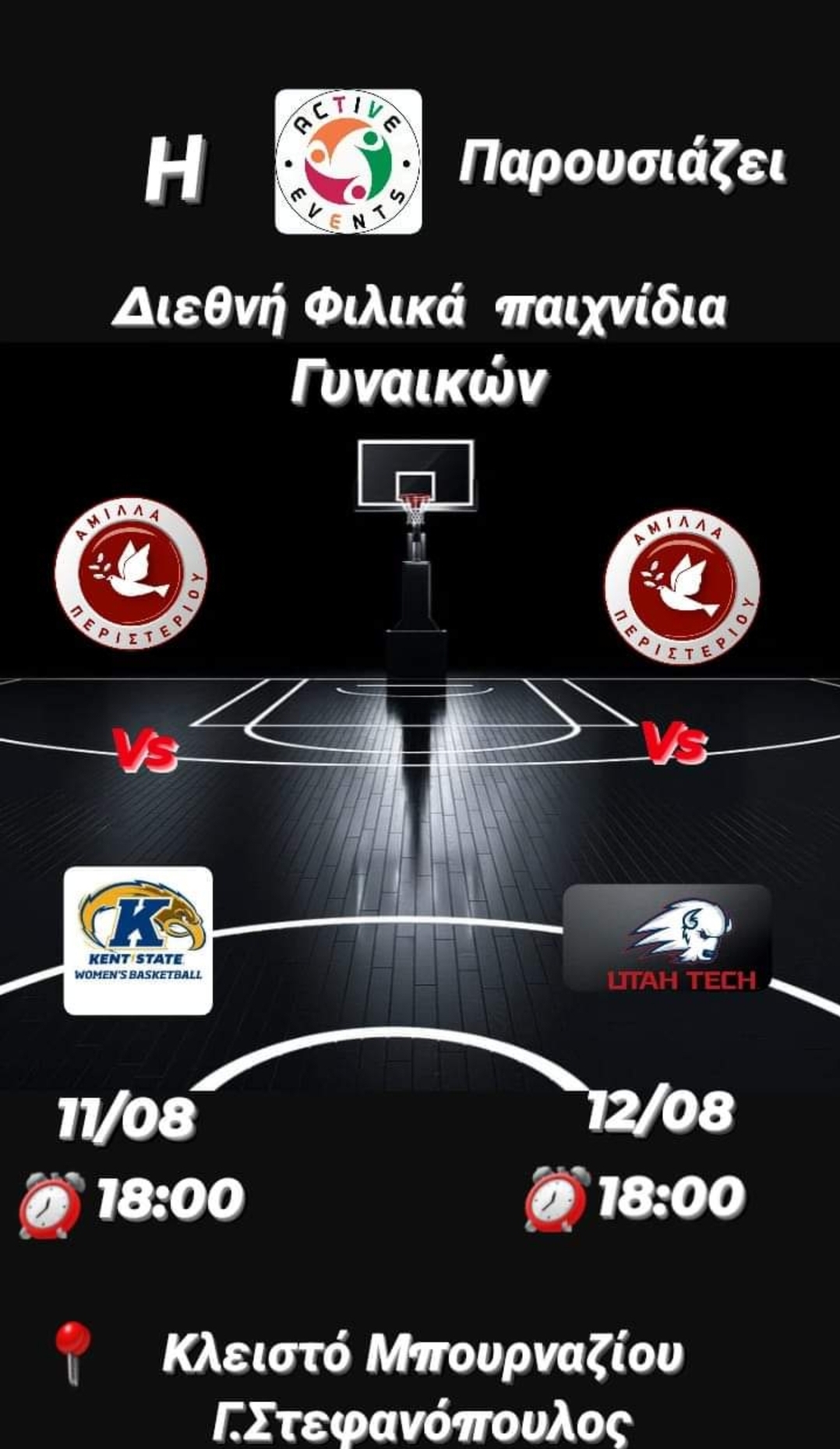 Με διοργανωτή τον Θοδωρή Ασημακόπουλο και την Active Events, την Παρασκευή 11 Αυγούστου και το Σάββατο 12 Αυγούστου θα πραγματοποιηθούν δύο φιλικοί αγώνες με την συμμετοχή φημισμένων κολεγίων των Η.Π.Α και της Άμιλλας Περιστερίου.