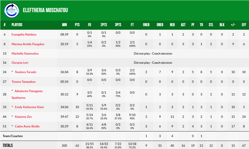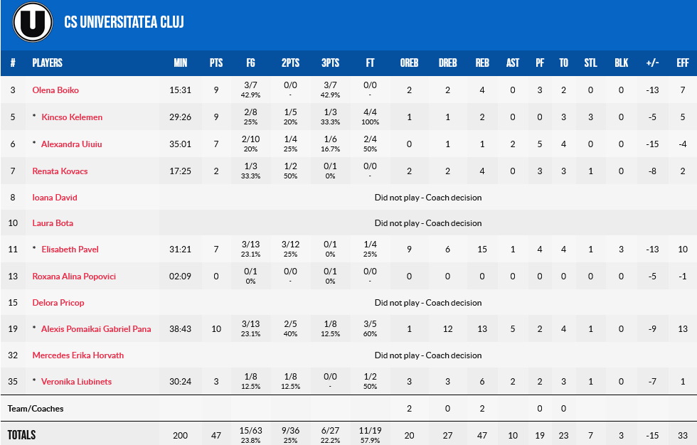 Απολαυστική η Ζετς με 22 πόντους και 11 ριμπάουντ, με την Κίσερ να έχει 10 πόντους, ενώ για την Κλουζ, η Πάνα είχε 12 πόντους και 13 ριμπάουντ.