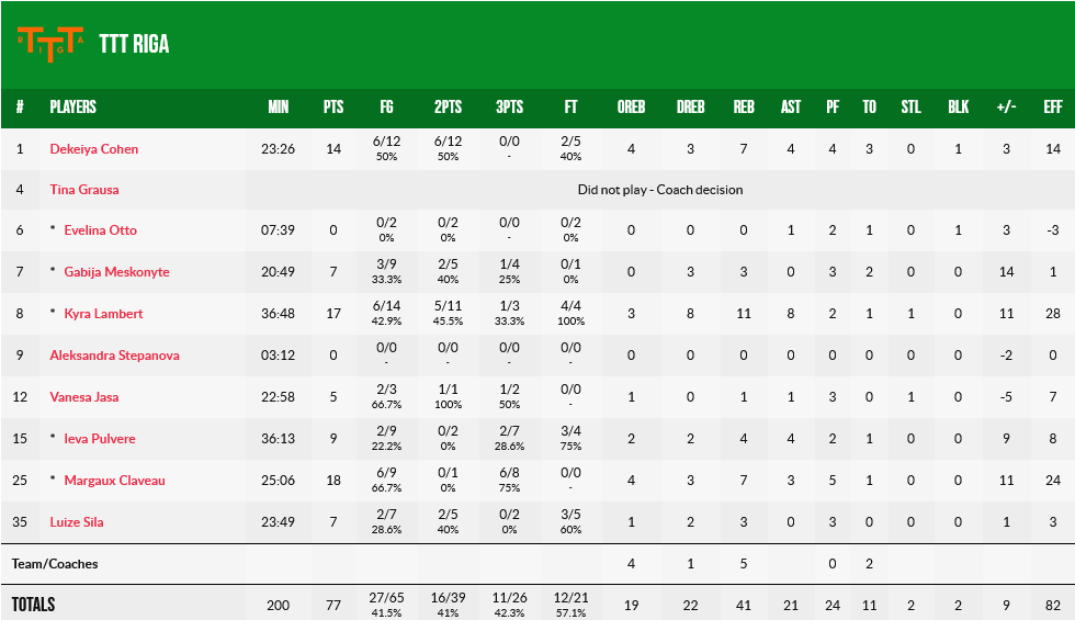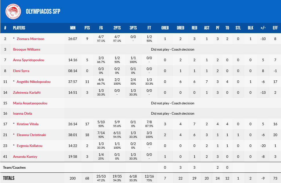 17 πόντους και επτά ριμπάουντ είχε η Βίτολα, ενώ 18 πόντους και έξι ριμπάουντ είχε η Χριστινάκη, ενώ η Νικολοπούλου είχε 11 πόντους, έξι ριμπάουντ και επτά ασίστ.