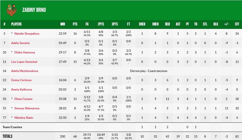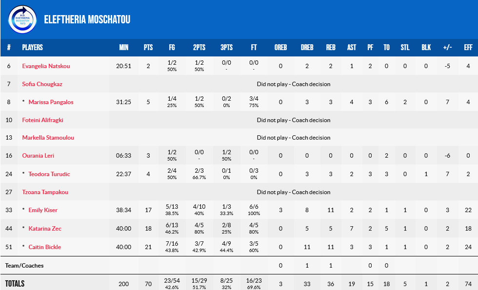 Η Μπικλ τελείωσε το ματς με 21 πόντους και 11 ριμπάουντ, με την Ζετς να ακολουθεί με 18 πόντους, επτά ασίστ και πέντε ριμπάουντ, ενώ ασταμάτητη ήταν και η Κάισερ με 17 πόντους και 11 ριμπάουντ.