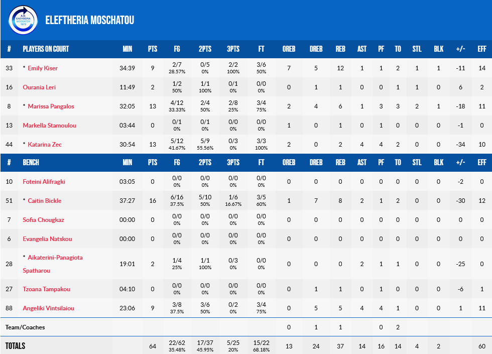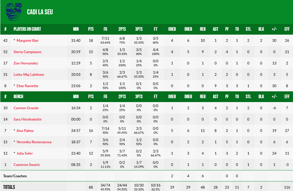16 πόντους και οκτώ ριμπάουντ είχε η Μπικλ, με τις Πάνκαλος και Ζεκ να έχουν από 13 πόντους. Για την Κάντι Λα Σο, η Μπερ είχε 18 πόντους και 10 ριμπάουντ, ενώ η Πάλμα… άγγιξε το triple double με 16 πόντους, 11 ριμπάουντ και οκτώ ασίστ.