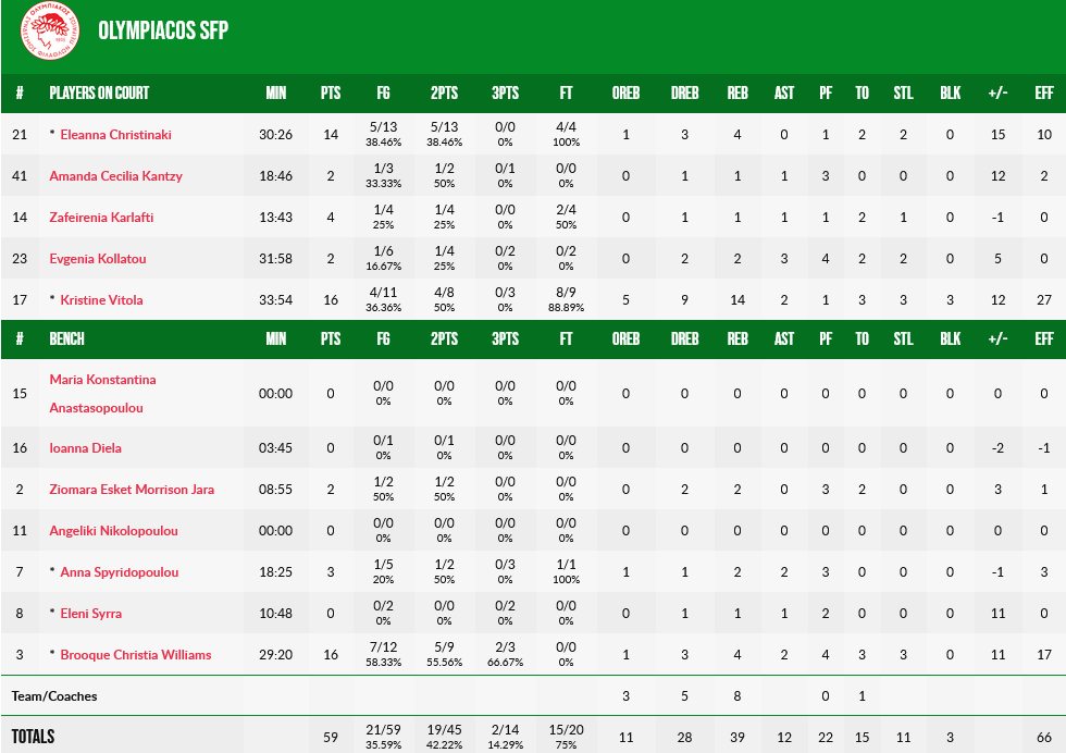 Εξαιρετικές Βίτολα και Γουίλιαμς με 16 πόντους, με την πρώτη να έχει κι 14 ριμπάουντ, ενώ 14 πόντους είχε η Χριστινάκη.