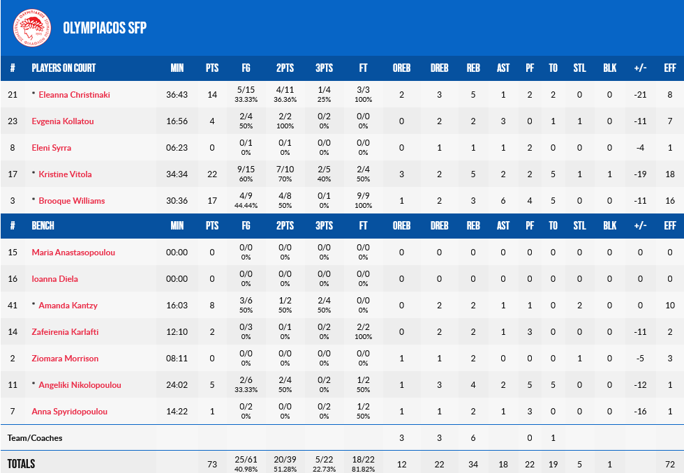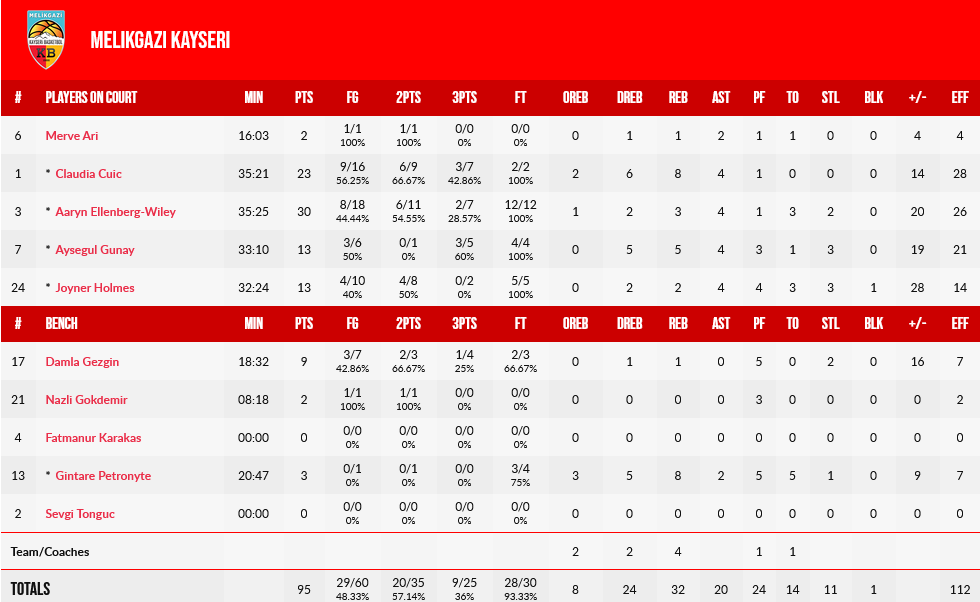 Η Βίτολα με 22 πόντους ήταν η πρώτη σκόρερ του Ολυμπιακού, με τις Γουίλιαμς και Χριστινάκη να ακολουθούν με 17 και 14 πόντους αντίστοιχα. Για την Καϊσέρι, η Γουάιλι ήταν ασταμάτητη με 30 πόντους, με την Τσούικ να προσθέτει 23.