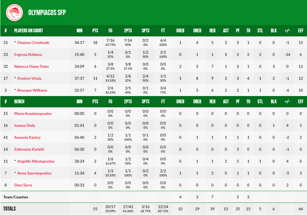 Δυνατό το ξεκίνημα του Ολυμπιακού στην τρίτη περίοδο, με τις «ερυθρόλευκες», χάρη σε ένα 1-7, να περνάνε μπροστά με 33-32. Η Ρίγα ανέλαβε και πάλι τα ηνία του ματς, με την ομάδα του Πειραιά, όμως, να παραμένει σε απόσταση βολής μέχρι το 38’ (40-37). Στα τελευταία 105’’, όμως, η ομάδα της Λετονίας έτρεξε ένα επιμέρους 7-2, που την έφερε στο +8 με το φινάλε του δεκαλέπτου (47-39). Ο Ολυμπιακός, όμως, δεν άφησε το παιχνίδι να του ξεφύγει και με ένα γρήγορο -5 μείωσε και πάλι στο σουτ (47-44) και λίγο αργότερα, Χριστινάκη και Βίτολα έφεραν το ματς στον πόντο (49-48). Το καλάθι της Τόμπιν στο 37’ έφερε το ματς στην… ισορροπία του τρόμου (53-53), όμως ένα 4-0 από τις Σίλα και Λάμπερτ, έφεραν την Ρίγα στο 57-53. Βίτολα και Χριστινάκη έχασαν δύο σημαντικές «ερυθρόλευκες» επιθέσεις, με την Λάμπερτ με 2/2 βολές να… σφραγίζει την νίκη της Ρίγα. Έτσι, το τελικό 59-55 φέρνει τον Ολυμπιακό στο 2-3, με την ομάδα της Λετονίας να φτάνει στο 4-0, διατηρώντας το αήττητο της στο Group F. Όσον αφορά την πρόκριση, θα ξεκαθαρίσει στην τελευταία «στροφή» στο ΣΕΦ, με αντίπαλο την ΜΒΚ Ruzomberok, με τις «ερυθρόλευκες» να θέλουν νίκη, ώστε να «σφραγίσουν» το εισιτήριό τους στον επόμενο γύρο του Eurocup
