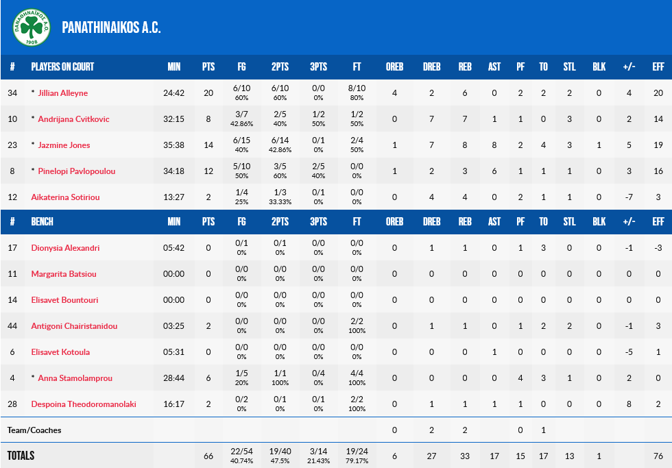 20 πόντοι και έξι ριμπάουντ ήταν ο απολογισμός της Αλέιν, στο ντεμπούτο της με την πράσινη φανέλα, με την Τζόουνς να έχει 14 πόντους, οκτώ ριμπάουντ και ισάριθμες ασίστ, ενώ η Παυλοπούλου είχε 12 πόντους.