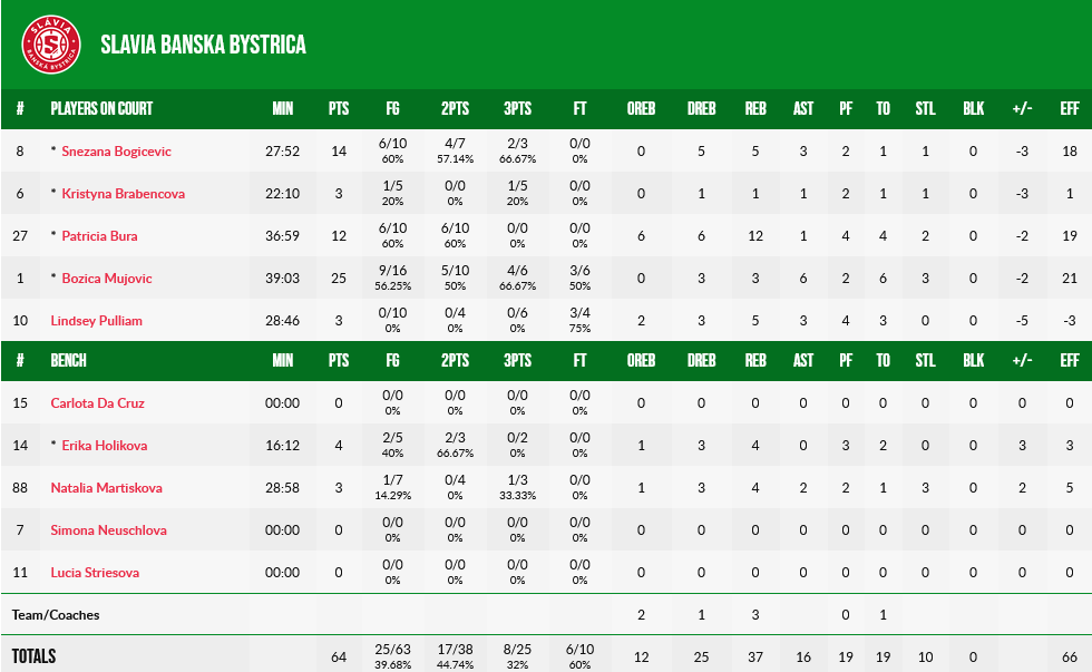 Για την Σλάβια, 25 πόντους αλλά και 0/2 βολές στο φινάλε του αγώνα, είχε η… μοιραία Μούγιοβιτς, με την Μπογκίσεβιτς να έχει 14 πόντους και την Μπούρα 12 πόντους και ισάριθμα ριμπάουντ.