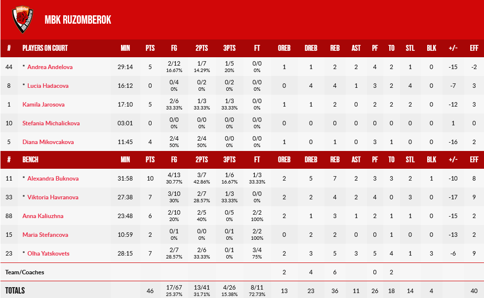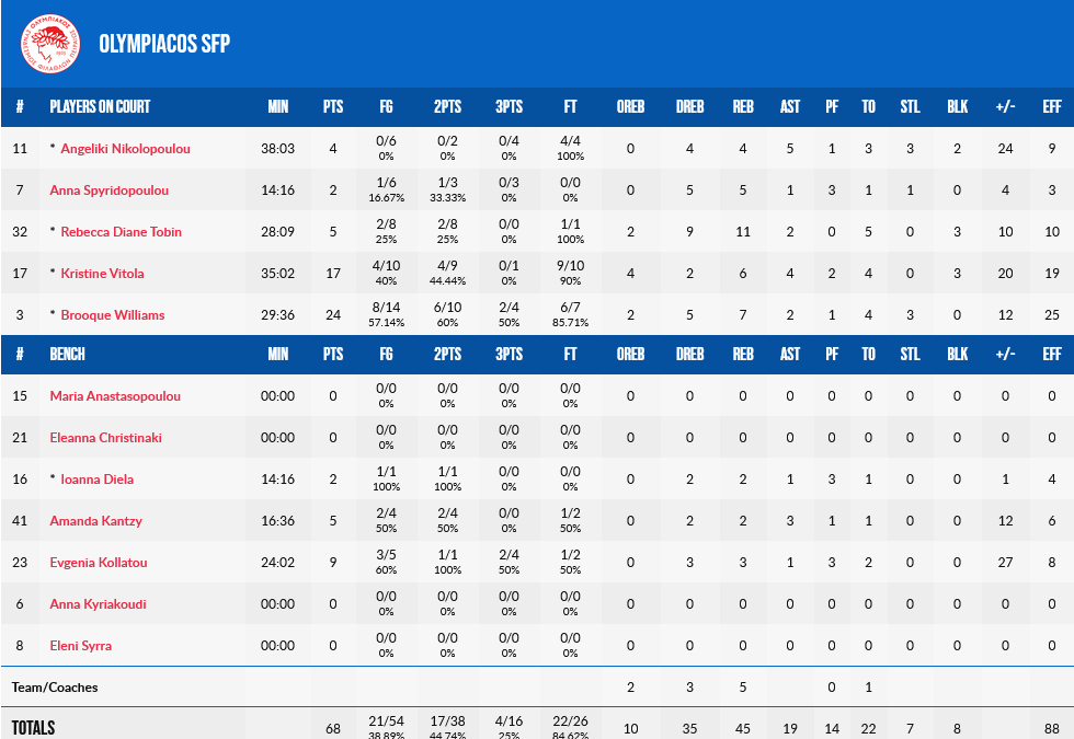Μπρουκ με 24 πόντους και Βίτολα με 17, ηγήθηκαν του «ερυθρόλευκου» σκοραρίσματος, ενώ για την Ρουζομπερόκ, η Μπούκνοβα ήταν η μοναδική διψήφια με 10 πόντους.