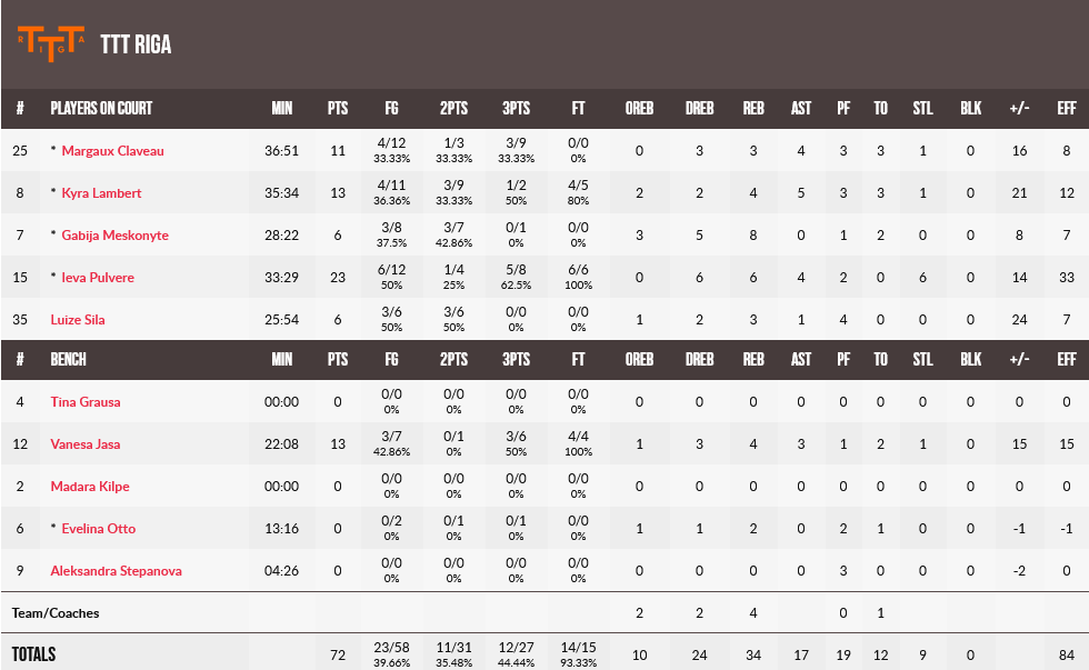 Η Γουίλιαμς με 11 πόντους ήταν η πρώτη σκόρερ του Ολυμπιακού, με τις Χριστινάκη και Τόμπιν να έχουν από 10, ενώ για την Ρίγα, 23 πόντους σημείωσε η Πουλβέρ.