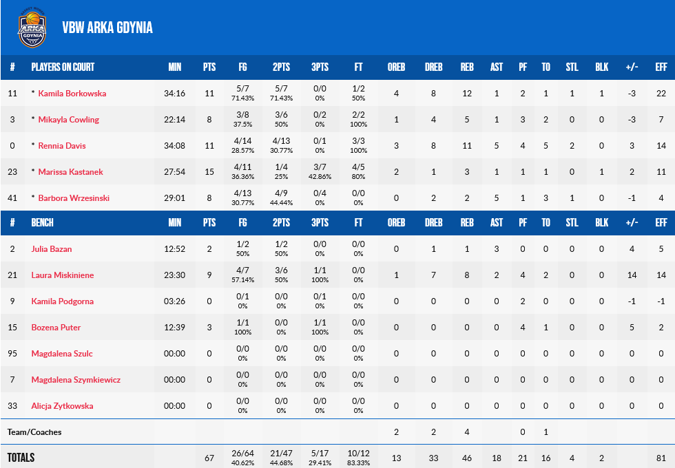 Για την Γκντίνια, η Κάστανεκ είχε 15 πόντους, η Ντέιβις 11 πόντους και ισάριθμα ριμπάουντ και η Μπόρκοσβκα 11 πόντους και 12 ριμπάουντ.