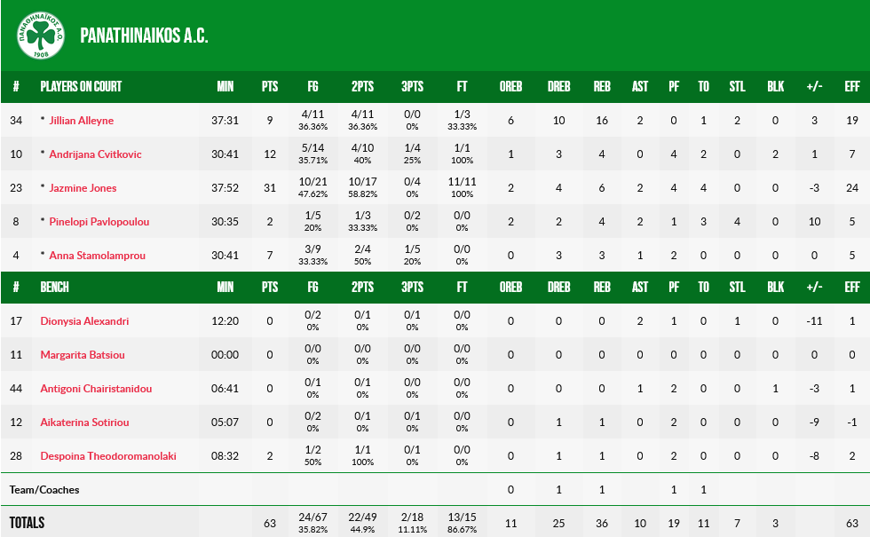 Εξαιρετική εμφάνιση από την Τζόουμς με 31 πόντους, με την Τσβίτκοβιτς να έχει 12 πόντους, ενώ η Αλέιν είχε εννέα πόντους και 16 ριμπάουντ.