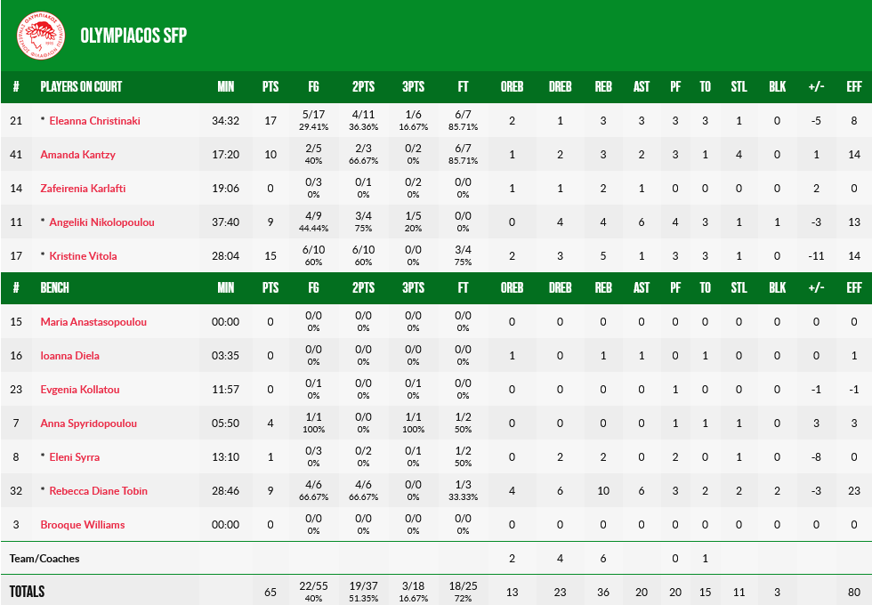 Η Χριστινάκη με 17 πόντους ηγήθηκε του «ερυθρόλευκου» σκοραρίσματος, με την Βίτολα να ακολουθεί με 15 και την Κάντζι με 10 πόντους.