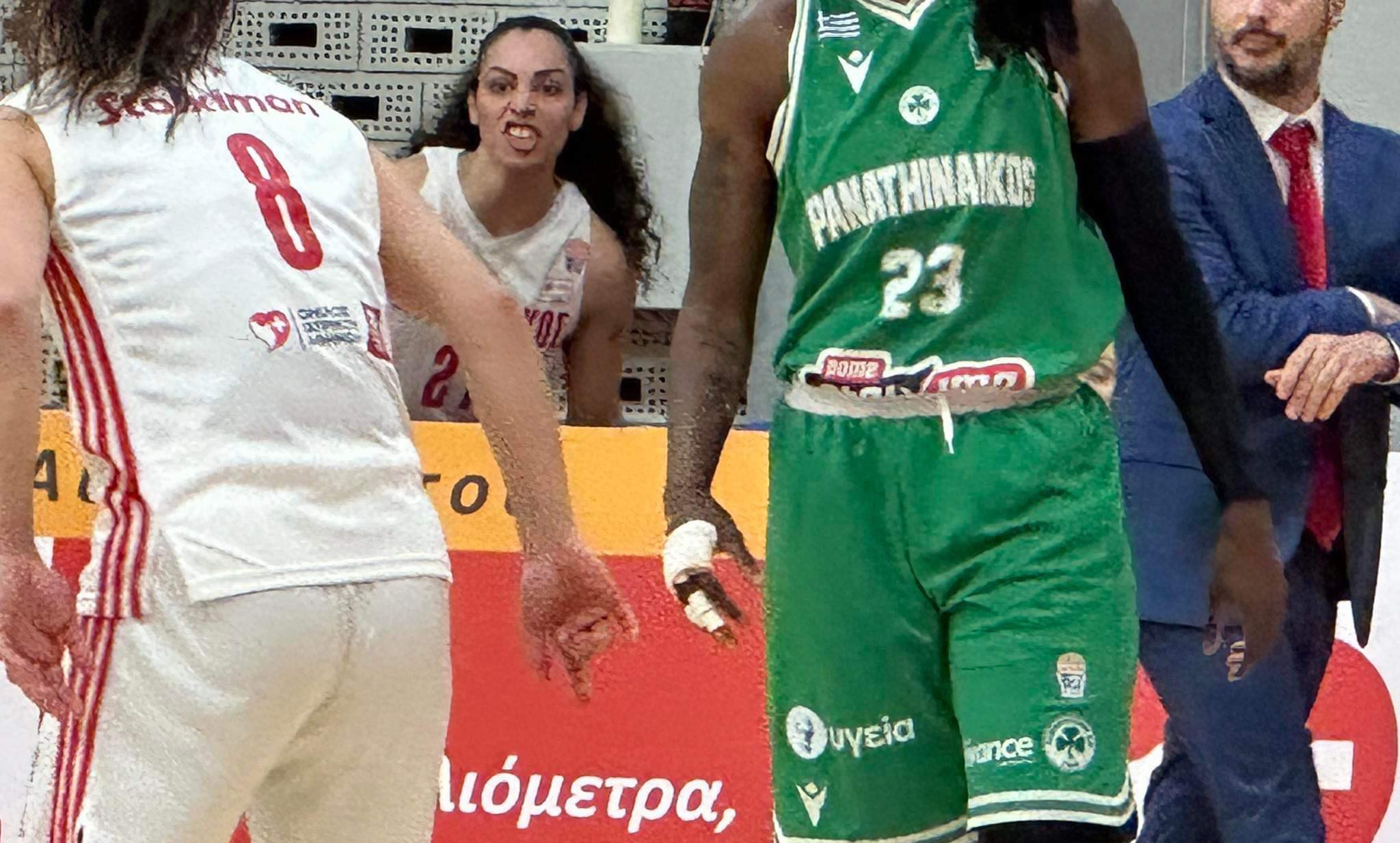 Η παίκτρια του Παναθηναϊκού δεν πήρε και τόσο ψύχραιμα το -14 του ημιχρόνου (39-25), με αποτέλεσμα, κατά την αποχώρηση της προς τα αποδυτήρια, να σπάσει το τζάμι της φυσούνας με γροθιά! Μάλιστα, με την επιστροφή των "πράσινων" στο παρκέ, για το β' μέρος, η παίκτρια του "τριφυλλιού" είχε δεμένο το χέρι της.