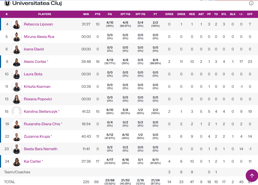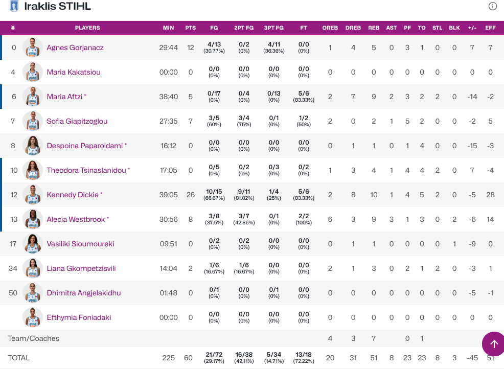 Εκπληκτική εμφάνιση από την Ντίκι με 26 πόντους και 10 ριμπάουντ, ενώ για την Κλουζ, η Κάρτερ είχε 17 πόντους και 10 ριμπάουντ και η Κορτέζ 16 πόντους και 13 ριμπάουντ.