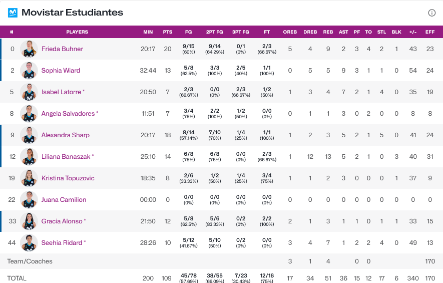 Σιουμερέκη και Γκομπερτζισβίλι σημείωσαν από επτά πόντους, ενώ για την Εστουντιάντες, των έξι διψήφιων παικτριών, η Μπούχνερ είχε 20 πόντους.