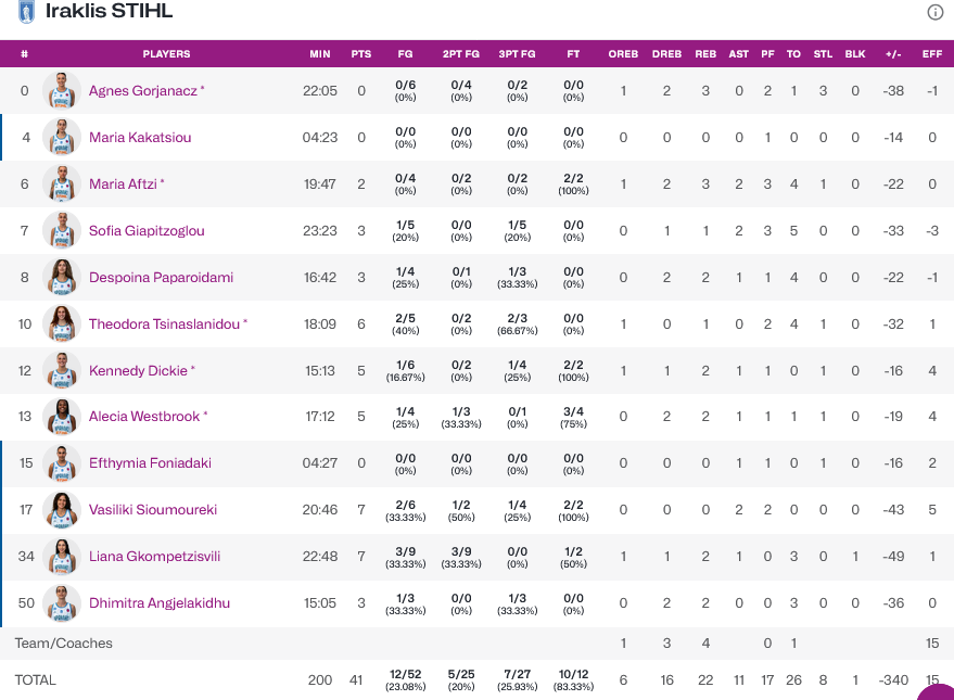 Η διαφορά δυναμικότητας ανάμεσα στις δύο ομάδες ήταν τεράστια και αυτό φάνηκε από το πρώτο ημίχρονο της αναμέτρησης, στο οποίο ο Ηρακλής σημείωσε μόλις 15 πόντους και δέχτηκε 56 (!) , με το -51 να… τελειώνει από πολύ νωρίς το όποιο ενδιαφέρον της αναμέτρησης, η οποία ολοκληρώθηκε με την ισπανική ομάδα νικήτρια με σκορ 41-109.