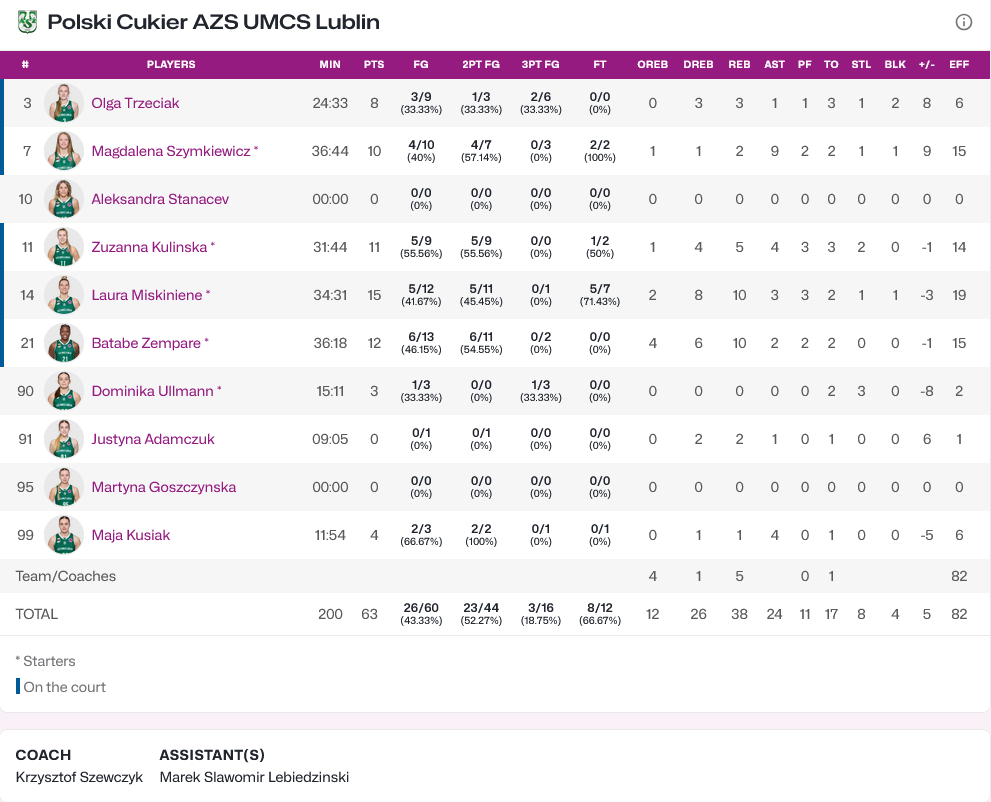 Η Μισκινίνε με 15 πόντους και 10 ριμπάουντ ήταν η πρωταγωνίστρια των νικητριών, με την Ζεμπάρε να πετυχαίνει ακόμη 12. Από τον Παναθηναϊκό ξεχώρισαν οι Καρακασίδου με 20 πόντους και 4 ριμπάουντ και Ντίξον που προσέθεσε ακόμη 12 πόντους.