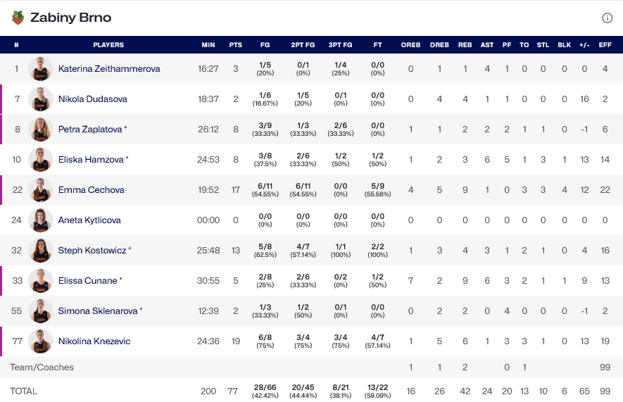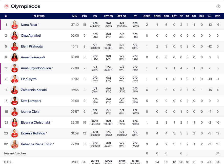 Η Χριστινάκη με 19 πόντους ήταν η πρώτη σκόρερ του Ολυμπιακού, με την Ράτσα να ακολουθεί με 15 και την Κολλάτου με 12. Για την Ζαμπίνι Μπρνο, η Κνέζεβιτς είχε 19 πόντους και η Τσέτσοβα 17.