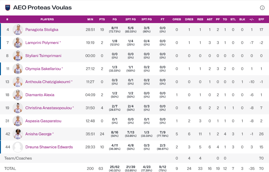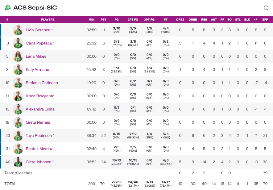 24 πόντους και 11 ριμπάουντ είχε η ασταμάτητη Τζορτζ, ενώ εξίσου εξαιρετική εμφάνιση έκανε και η Στολίγκα με 19 πόντους. Για την Σέπσι, η Τζόνσον είχε 24 πόντους και 14 ριμπάουντ και η Ρόμπινσον 22 πόντους.