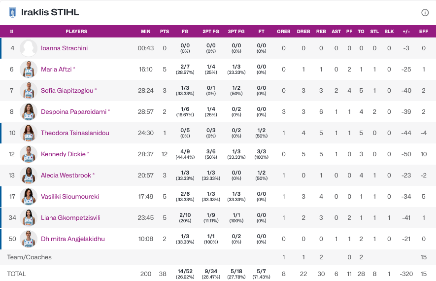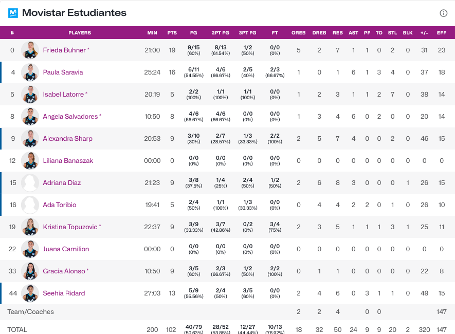 Η Κένεντι Ντίκι με 12 πόντους, ήταν η μοναδική διψήφια παίκτρια του Ηρακλή, ενώ για την Εστουντιάντες, η Μπούχνερ είχε 19 πόντους και η Σαράβια 16.
