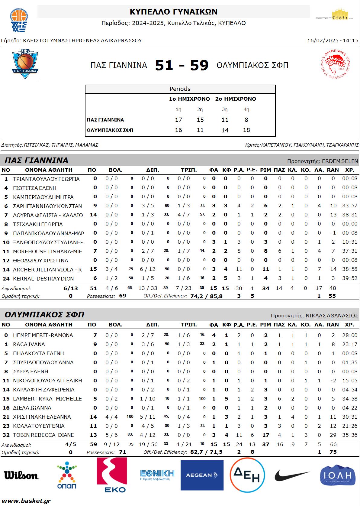Ο Ολυμπιακός τα βρήκε… σκούρα απέναντι στον σκληροτράχηλο ΠΑΣ Γιάννινα, όμως, ένα… σπριντ στα τελευταία λεπτά, επέτρεψε στις «ερυθρόλευκες» να φτάσουν στην νίκη με 59-51 και στην κατάκτηση του κυπέλλου Γυναικών, για την σεζόν 2024/25 και για έκτη φορά στην ιστορία τους.