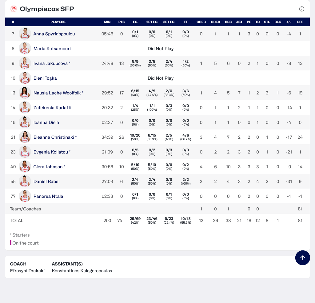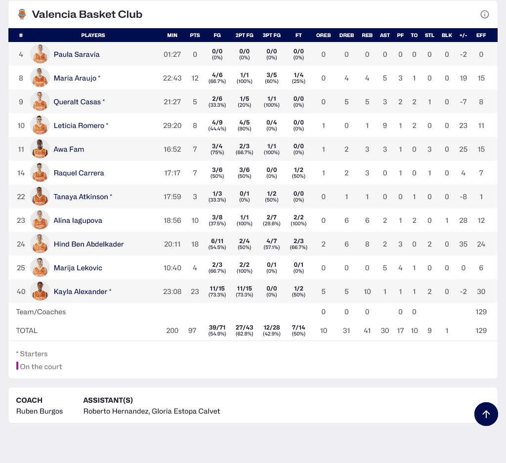 Κορυφαία για τις ερυθρόλευκες ήταν η Ελεάννα Χριστινάκη με 26 πόντους και 7 ριμπάουντ και ακολούθησε η Γουολφοκ με 17 πόντους, 5 ριμπάουντ και 7 ασσίστ. Για τις Ισπανίδες ξεχώρισε η Αλεξάντερ με 23.