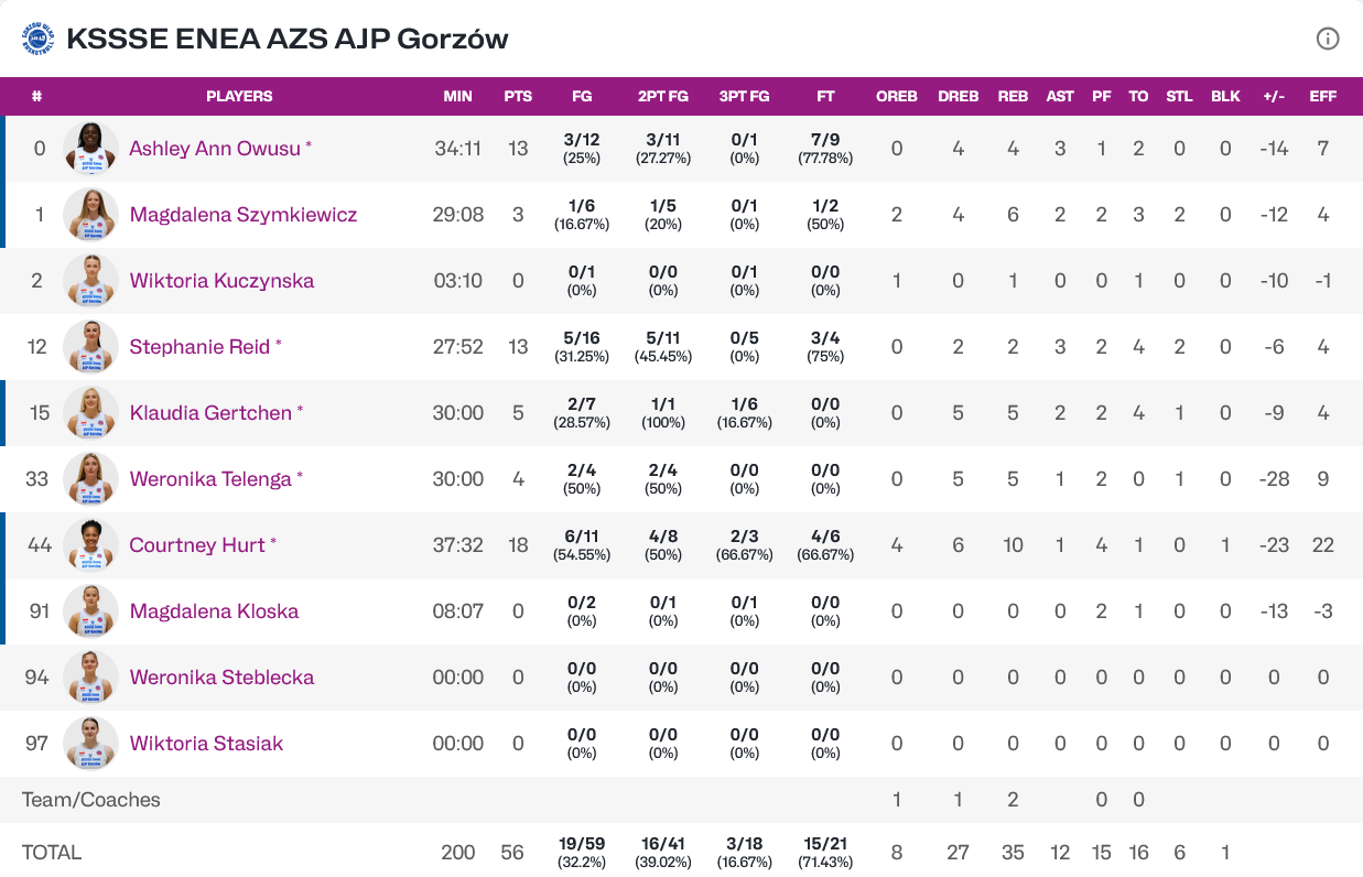 31 πόντους και 13 ριμπάουντ είχε η απολαυστική Πρινς, με την Μπερτς να ακολουθεί με 12 πόντους, ενώ για την Γκορζόβ, η Χαρτ είχε 16 πόντους και 10 ριμπάουντ, με την Ριντ να προσθέτει 13.