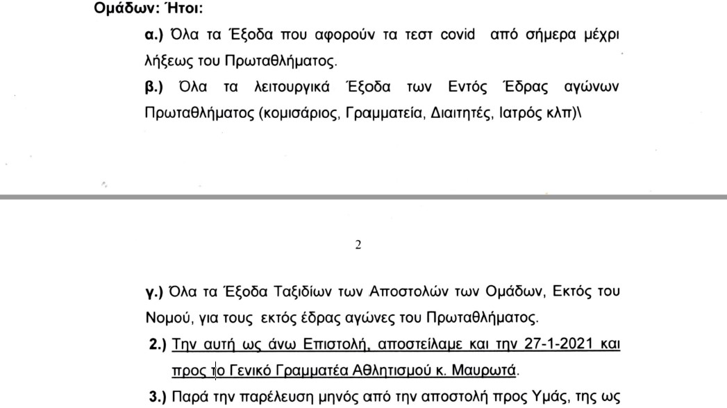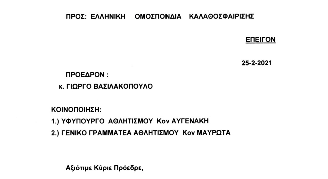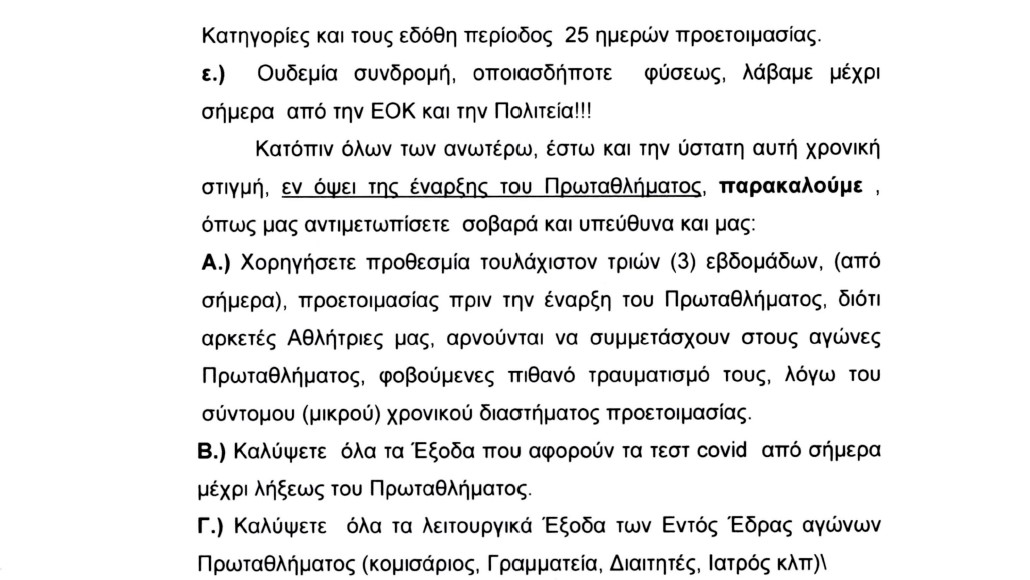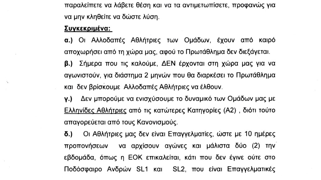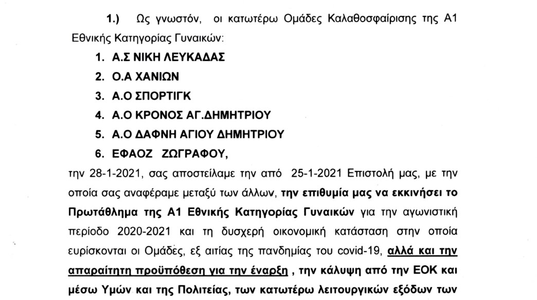 Επιστολή προς την ΕΟΚ και τον Πρόεδρο της Ομοσπονδίας, Γιώργο Βασιλακόπουλο,, την οποία κοινοποίησαν και στους Λευτέρη Αυγενάκη και Γιώργο Μαυρωτά, με την οποία τους καλούν να σταθούν στο ύψος των περιστάσεων, ενόψει της επανεκκίνησης του πρωταθλήματος της Α1 Γυναικών, απέστειλαν οι Νίκη Λευκάδας, Χανιά, Σπόρτιγκ, Κρόνος Αγίου Δημητρίου, Δάφνη Αγίου Δημητρίου και ΕΦΑΟΖ.