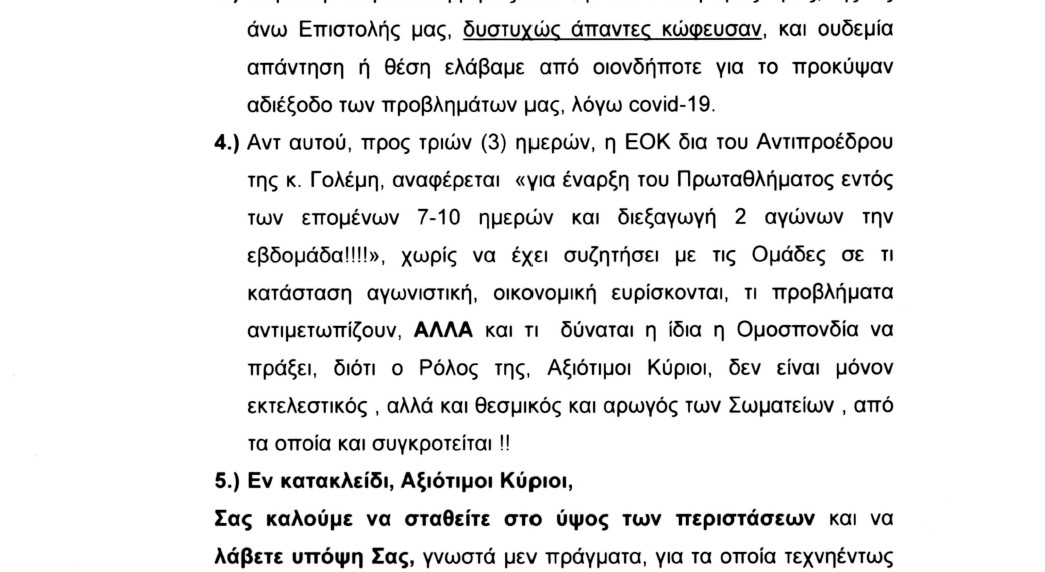 Όπως υποστηρίζει η νέα επιστολή των ομάδων, δεν υπήρξε η παραμικρή απάντηση, τόσο από την Ομοσπονδία, όσο και από την Πολιτεία, στην οποία είχε κοινοποιηθεί η αρχική επιστολή. Αντίθετα, ενημερώθηκαν για την επανεκκίνηση του πρωταθλήματος, με διπλές αγωνιστικές κάθε εβδομάδα, χωρίς όμως να υπάρξει η παραμικρή συζήτηση με τις ομάδες, αλλά και χωρίς η ΕΟΚ να έχει ξεκαθαρίσει τι ακριβώς πρόκειται να πράξει.