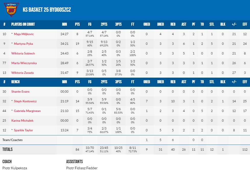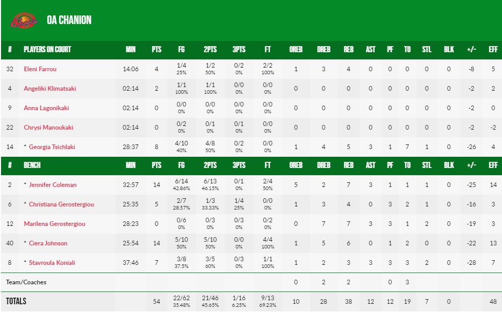 Από τις γηπεδούχες ξεχώρισε η Πίκα με 19 πόντους, ενώ από την ομάδα των Χανίων πρώτες σκόρερ αναδείχθηκαν οι με Κόλεμαν και Σιέρα με 14 πόντους έκαστη.