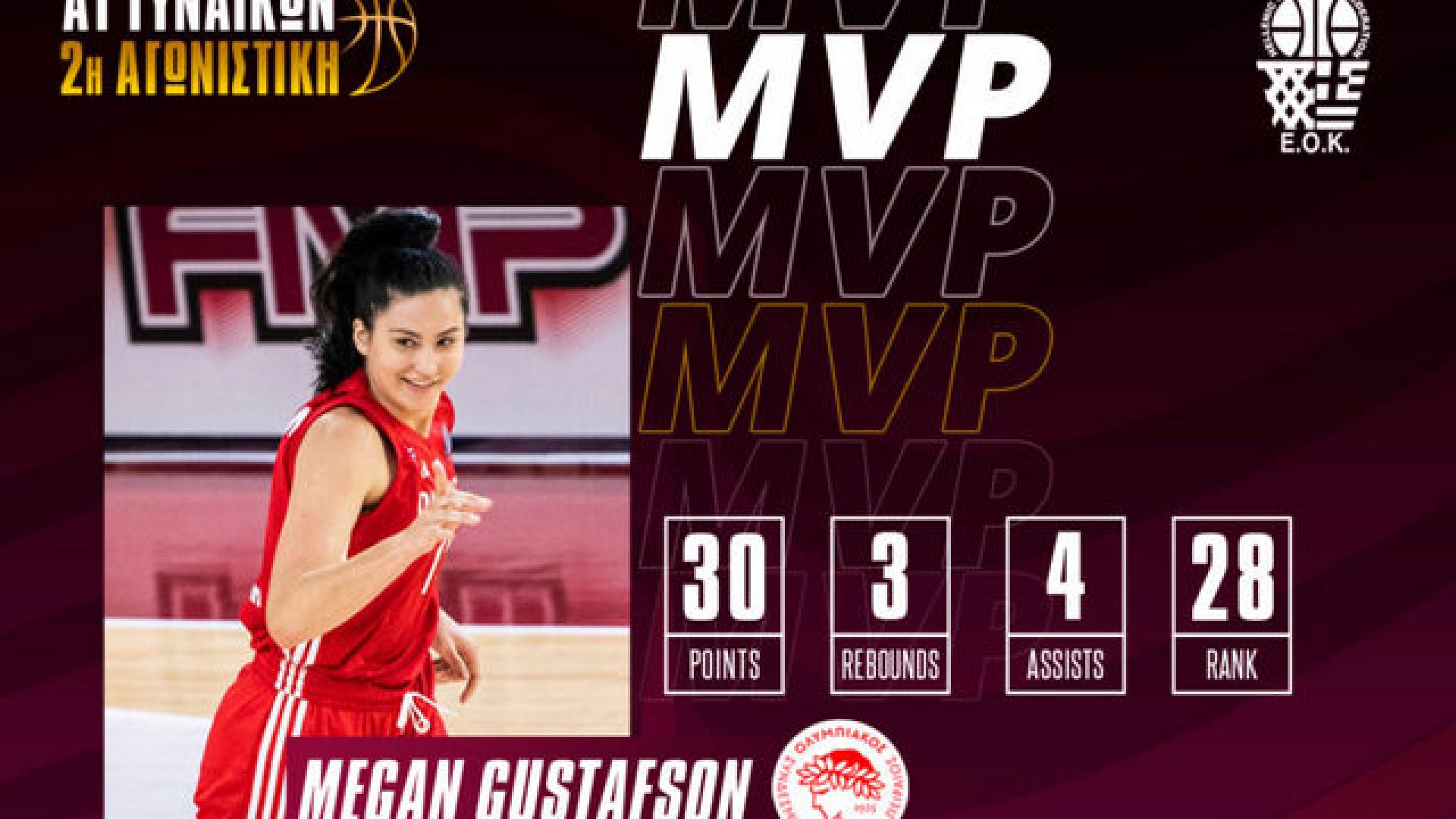 Η Γκούσταφσον στην νίκη της ομάδας της με 70-59 επί του Εύνικου είχε 30 πόντους, 3 ριμπάουντ, 4 ασίστ και 28 στο σύστημα αξιολόγης.