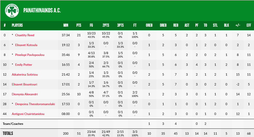 Οι πράσινες είχαν σε μεγάλη μέρα την Τσάσιτι Ριντ που σημείωσε 21 πόντους, ενώ καλή εμφάνιση πραγματοποίησε και η Αλεξανδρή με 10 πόντους, 3 ριμπάουντ και 3 ασίστ.