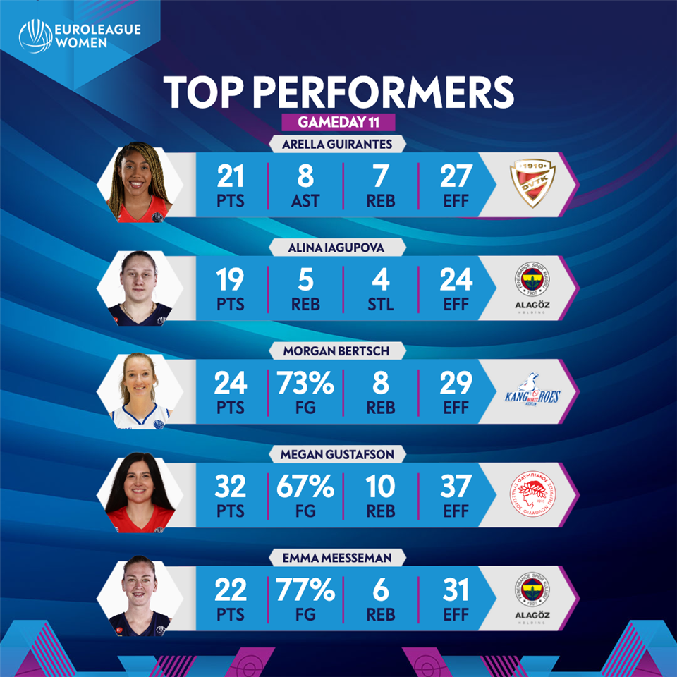 Η Αμερικανίδα σέντερ έμεινε στο παρκέ για πάνω από 36 αγωνιστικά λεπτά, έχοντας 32 πόντους, 10 ριμπάουντ και 3 κλεψίματα. Με αυτό το νταμπλ νταμπλ συγκέντρωσε 37 μονάδες στο σύστημα αξιολόγησης και είναι η πρώτη ανάμεσα σε όσες παίκτριες ξεχωρίζουν στην 11η αγωνιστική.